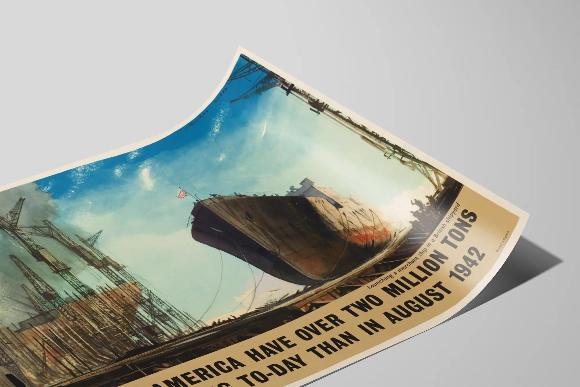 Ta plakat vintage wspaniale ilustruje wypuszczenie statku handlowego w brytyjskiej stoczni, podkreślając znaczną wagę flot morskich Wielkiej Brytanii i Stanów Zjednoczonych. To dzieło dekoracji ściennej przyciąga wzrok dzięki odcieniom łączącym błękitne niebo i szary dym, symbolizując jednocześnie potęgę przemysłową i kontekst historyczny morski. Plakat przedstawia duży statek w trakcie wodowania, dumnie noszący brytyjską flagę na szczycie, otoczony przez imponujące dźwigi na placu budowy. Ten element dekoracji ściennej skierowany jest do wszystkich pasjonatów historii morskiej, przemysłu stoczniowego i sztuki retro, pragnących ozdobić wnętrze autentycznym plakatem pełnym silnych symboli. Kontrasty między masywną sylwetką statku a szczegółową strukturą dźwigów tworzą żywy obraz, który świadczy o wysiłku wojennym i zdolnościach przemysłowych obu narodów. Idealny do biura, salonu lub biblioteki, ten vintage plakat oferuje atmosferę zarówno nostalgii, jak i dynamizmu, doskonałą do upiększenia każdego ściany z nutą historyczną. Obrazek dodatkowo podkreśla mocną typografię u dołu, informującą o przewadze tonażu statków w służbie w 1943 roku w porównaniu do 1942, nadając obrazowi wymiar informacyjny i dekoracyjny. Ta dekoracja ścienna doskonale wpisuje się w świat przemysłowy, współczesny lub klasyczny, wnosząc oddech odwagi i pamięci wokół tematyki morskiej. Plakat wyróżnia się starannie wykonanym stylem graficznym, łączącym ilustrację z realizmem malarskim, co czyni go zarówno estetycznym, jak i sugestywnym elementem dekoracyjnym. Umożliwia wyraziste personalizowanie ściany, tchnąc życie w historię, jednocześnie oferując znakomitą jakość wizualną.