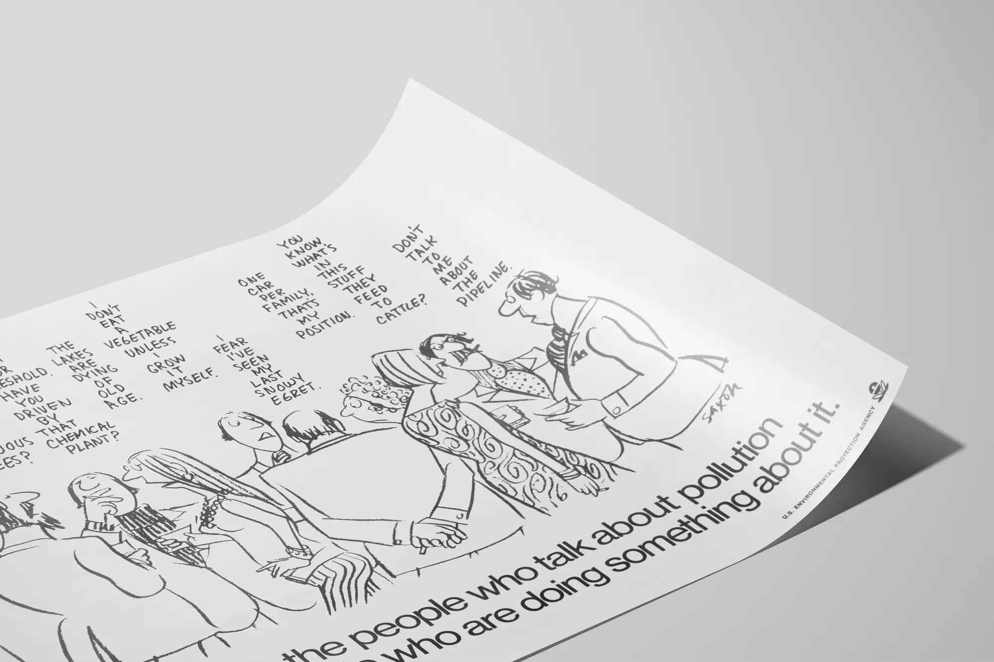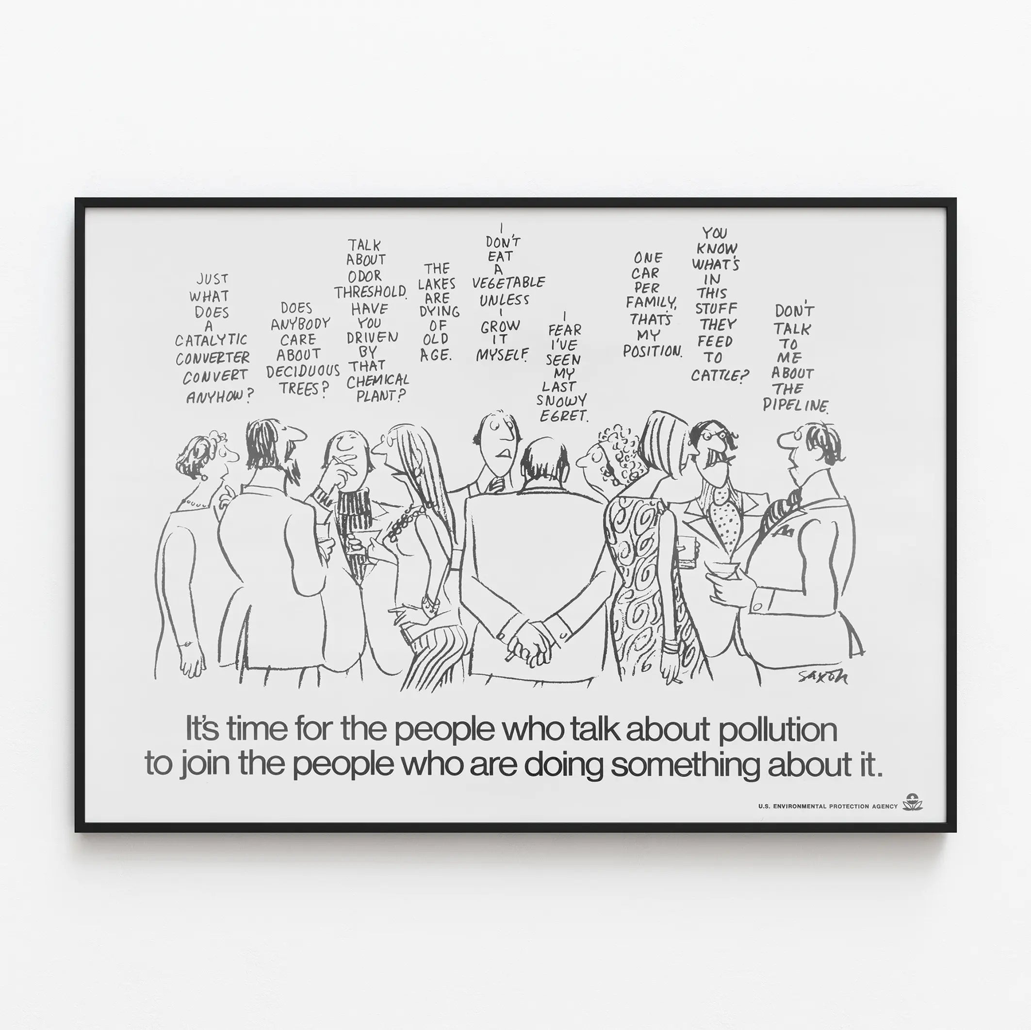 Ta vintage plakat edukacyjny o zanieczyszczeniu środowiska, opracowany przez Agencję Ochrony Środowiska Stanów Zjednoczonych, stanowi doskonały wybór dekoracji ściennej dla tych, którzy pragną połączyć zaangażowanie ekologiczne z stylem retro. Czarnobiały projekt przedstawia grupę postaci narysowanych w stylu komiksowym, dyskutujących i zastanawiających się nad różnymi aspektami zanieczyszczenia i środowiska, takimi jak katalizatory, drzewa liściaste, zakłady chemiczne, jakość powietrza i wody, czy też praktyki rolnicze. Ten plakat zachęca do przejścia od słów do działań, z jasnym i zaangażowanym przesłaniem na dole: „Czas, aby ludzie mówiący o zanieczyszczeniu, dołączyli do tych, którzy coś z tym robią”, podkreślając pilną potrzebę podjęcia konkretnych działań przeciwko zanieczyszczeniu. Ta dekoracja ścienna jest idealna do biura, sali konferencyjnej lub przestrzeni poświęconej edukacji ekologicznej. Wnosi zarówno elementy edukacyjne, jak i estetyczne dzięki prostemu i wyrazistemu rysunkowi, jednocześnie przekazując mocne przesłanie o znaczeniu zbiorowej odpowiedzialności. Ta papierowa tablica ścienna, z minimalistyczną grafiką i zaangażowaną treścią, doskonale odpowiada potrzebom miłośników plakatów tematycznych i obrońców przyrody, którzy chcą ozdobić swoje ściany obrazami pełnymi znaczenia.