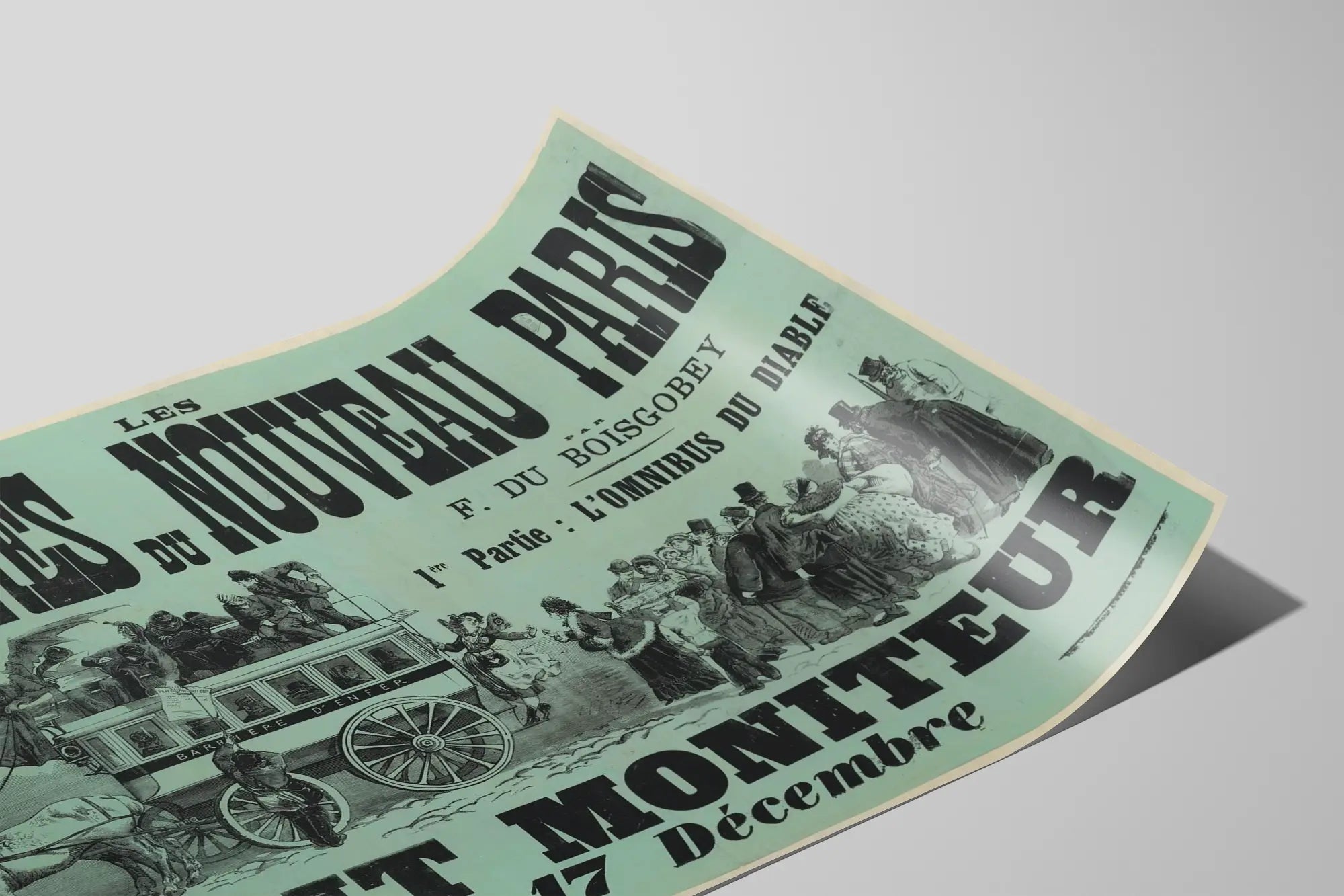 Ta vintage plakat zatytułowany "Tajemnice Nowego Paryża", autorstwa F. du Boisgobey, jest elementem dekoracji ściennej, który z pewnością przypadnie do gustu miłośnikom sztuki historycznej i starożytnej grafiki. Przedstawiając ożywioną scenę wokół omnibusu o nazwie "L'Omnibus du Diable", plakat łączy tekst i ilustrację w stylu charakterystycznym dla XIX wieku, przypominając plakaty tamtej epoki i ilustrowane gazety.