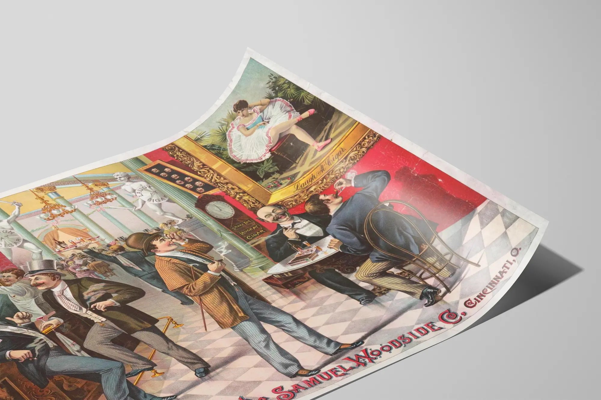 Poznaj tę kolorową, vintage plakat zatytułowany „The Samuel Woodside Co., Cincinnati, O.”, będący prawdziwym historycznym elementem dekoracji ściennej, który doda retro uroku i eleganckiej atmosfery Twojemu wnętrzu. Ta szczegółowa ilustracja ukazuje ożywioną scenę wewnątrz eleganckiego lokalu, gdzie mężczyźni w strojach z epoki palą cygara i towarzysko spędzają czas w przyjaznej i wyrafinowanej atmosferze.