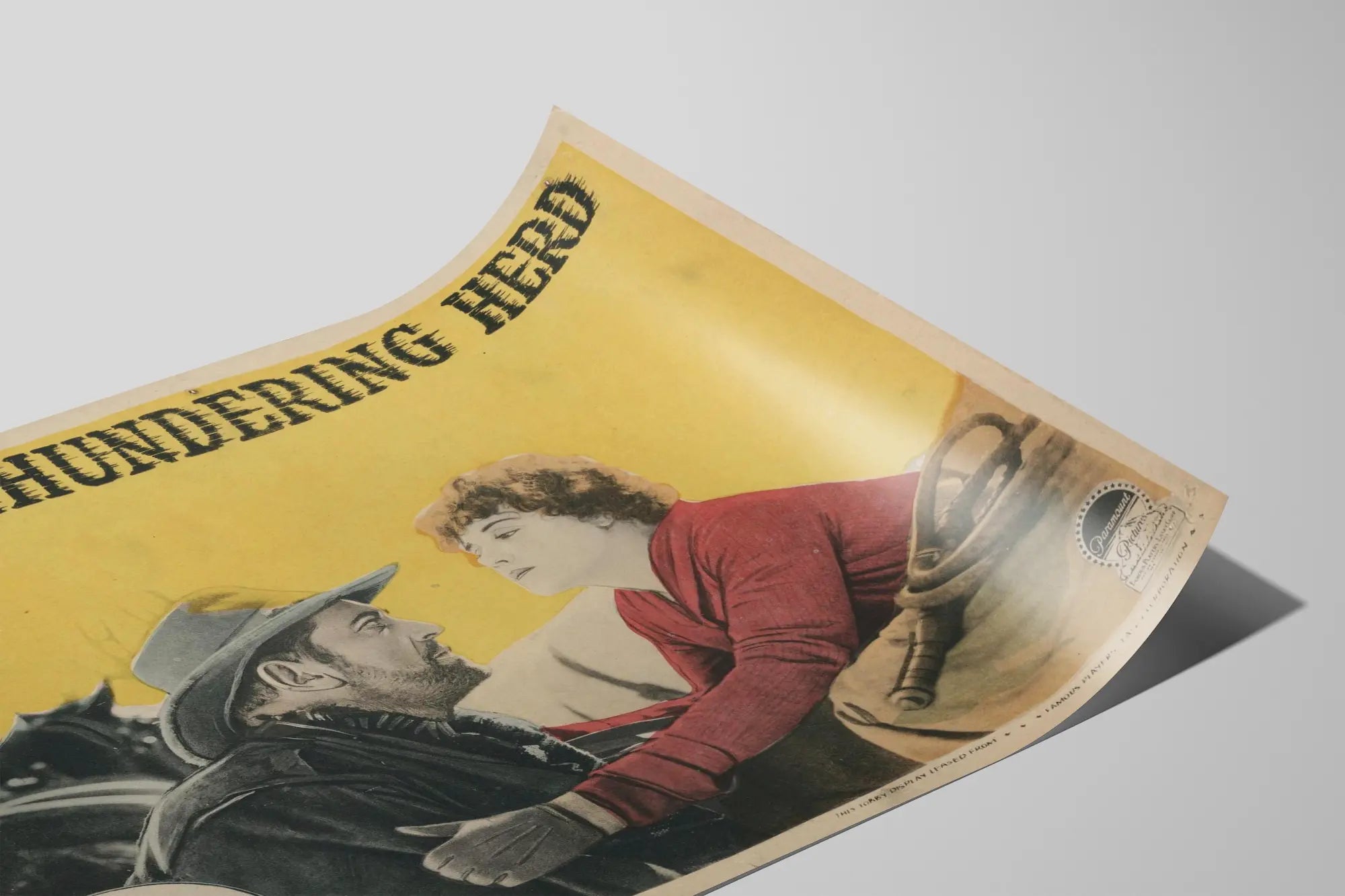 Odkryj tę ikoniczną plakatową reprodukcję vintage zatytułowaną "The Thundering Herd", inspirowaną dziełem Zane Grey'a. Ten stary plakat, oznaczony napisem "A Paramount Picture", przywołuje cały urok amerykańskiego kina klasycznego. Na jasnym żółtym tle, ten obraz przedstawia brodatego mężczyznę w kapeluszu kowboja oraz kobietę ubraną na czerwono, uchwycając moment pełen emocji. Klimat westernu podkreślają elementy takie jak koń w tle i akcesoria z tamtej epoki, oferując dekorację ścienną o autentycznym i retro charakterze. To dzieło, idealne dla miłośników kina klasycznego i dekoracji vintage, wnosi do wnętrza nutę nostalgii i historii. Użyj tego plakatu jako głównego elementu w salonie lub biurze, aby stworzyć ciepłą i porywającą atmosferę, opowiadającą historię. Stylizowana typografia na szczycie plakatu dodaje interesujący wymiar graficzny, wzmacniając wizualną atrakcyjność tej dekoracji ściennej. Niezależnie od tego, czy jesteś pasjonatem westernów, czy po prostu szukasz oryginalnego plakatu, ten unikalny egzemplarz stanowi doskonałą opcję, aby wzbogacić ściany ponadczasowym i eleganckim stylem.