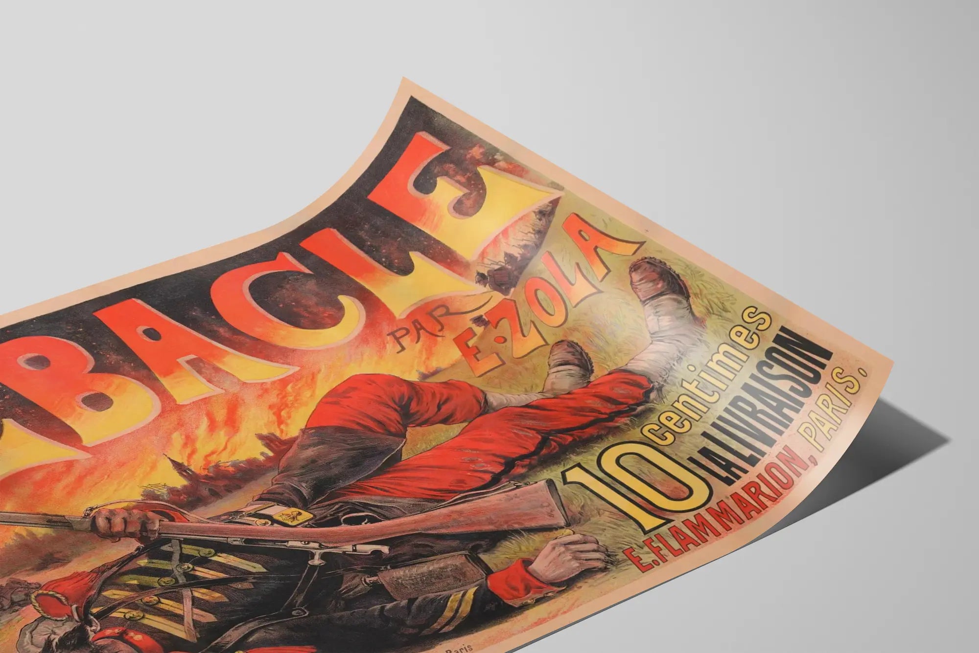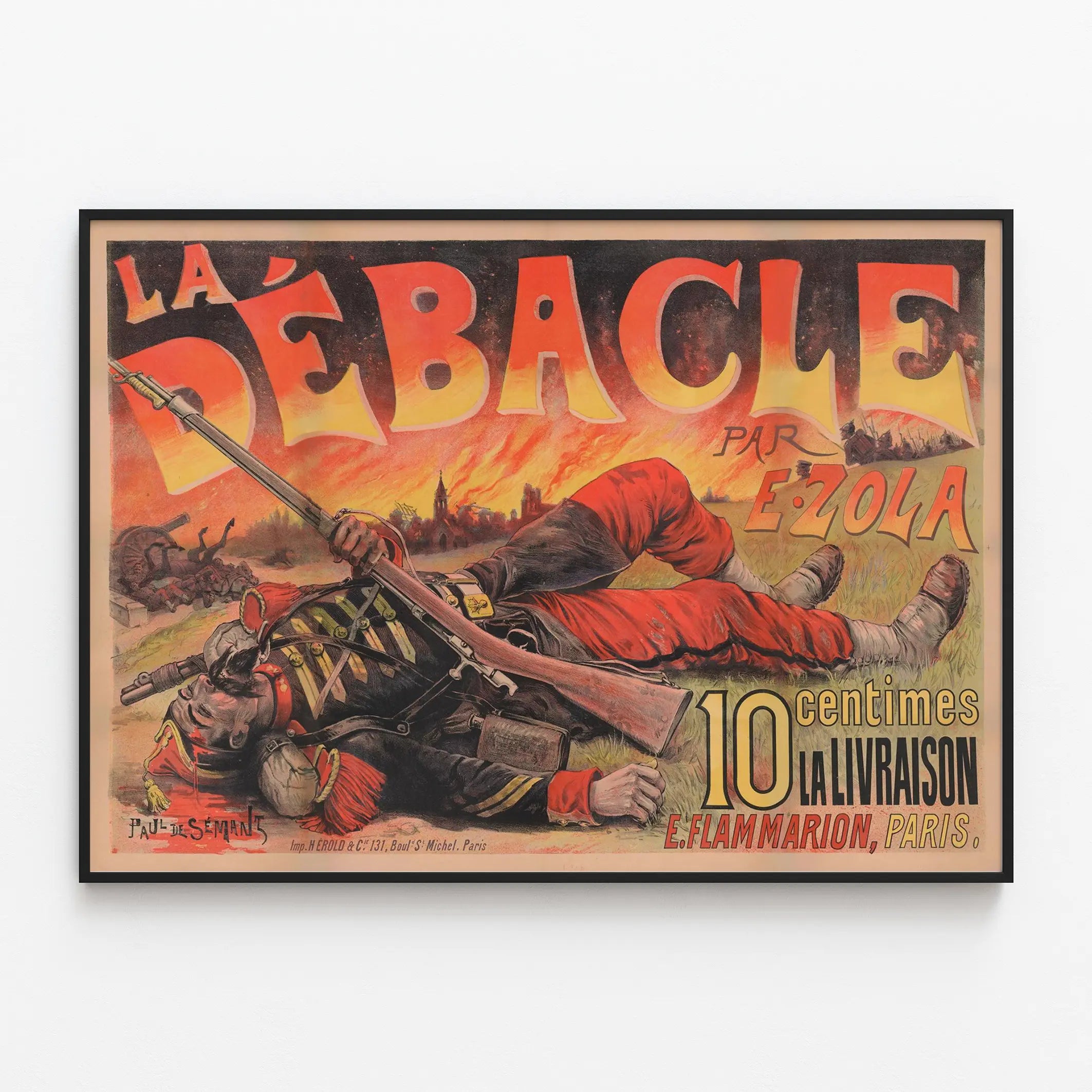Ta vintage plakat ilustrowany przez Paula de Sémantis przedstawia uderzającą wizję powieści historycznej "La Débâcle" Émile'a Zoli. Zaprojektowany w stylu klasycznym i dramatycznym, ten dekoracyjny element ścienny ukazuje żołnierza leżącego na ziemi, ubranego w szczegółowy mundur wojskowy, trzymającego karabin, co wywołuje skojarzenia z brutalnością i rozpaczą wojny. Tło w ogniu symbolizuje zniszczenie, podkreślając dramatyczny nastrój obrazu. Ten plakat to doskonały wybór dla miłośników literatury i historii, którzy chcą wzbogacić swoje wnętrze o dzieło zarówno artystyczne, jak i pełne wyrazu. Idealny jako plakat lub dekoracja ścienna, łatwo wkomponuje się w salon, biuro czy bibliotekę, dodając odrobinę vintage'owej elegancji i stanowiąc interesujący punkt rozmowy. Duża, kolorowa typografia tytułu "LA DÉBÂCLE" od razu przyciąga uwagę, podczas gdy całość elementów graficznych odzwierciedla historyczny i literacki kontekst XIX wieku. Dzieło to, wydrukowane we Francji przez H. Érold & Cie, z oznaczeniem wydawniczym E. Flammarion Paris, potwierdza swoją autentyczność i bezpośredni związek z francuskim środowiskiem wydawniczym. Jego artystyczny styl, połączony z silnym wpływem wizualnym, czyni ten plakat wyjątkowym wyborem do oryginalnej dekoracji ściennej, łączącej sztukę, historię i literaturę.
