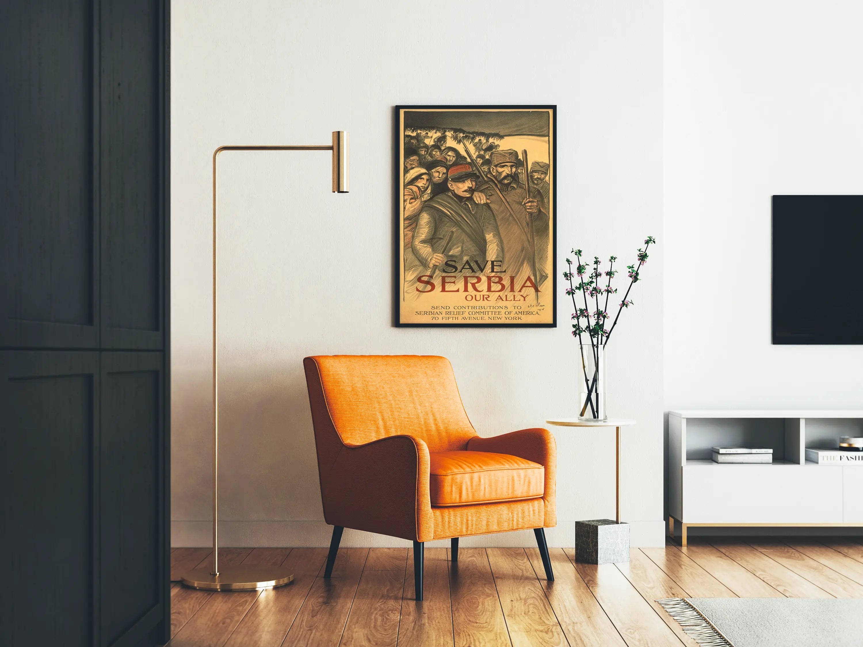 Poznaj ten wyjątkowy plakat vintage zatytułowany „Zachowaj Serbię, nasz sojusznik”, będący prawdziwym dziełem dekoracji ściennej o silnym kontekście historycznym. Ten plakat ukazuje z mocą i emocjami scenę przedstawiającą serbskich żołnierzy i cywilów, symbolizującą solidarność i apel o pomoc w trudnym okresie. Dominują ciepłe, ziemiste odcienie, podkreślając realizm rysów postaci, gdzie mieszają się zmęczenie, determinacja i nadzieja. Plakat ten ukazuje kampanię solidarności zorganizowaną przez Serbijski Komitet Pomocy w Nowym Jorku, zachęcając do wysyłania darowizn na wsparcie Serbii. To wizualne dzieło, bogate w symbolikę, będzie wyrazistym dodatkiem do wnętrza, jeśli jesteś miłośnikiem dekoracji ściennych w stylu retro, vintage lub historycznym. Doskonale pasuje do przestrzeni mieszkalnych, biur czy sal wystawowych, wnosząc odrobinę autentyczności i historii. Ten plakat może również stanowić element tematycznej kolekcji ściennej związanej z wojną, międzynarodową solidarnością lub II wojną światową, w zależności od dokładnego okresu, choć nie jest to tutaj określone. Dzięki starannie opracowanej kompozycji i silnemu efektowi wizualnemu, ten plakat jest zaproszeniem do refleksji nad więziami przyjaźni między narodami i wsparciem w czasach kryzysu. Idealny dla pasjonatów historii i miłośników unikalnej dekoracji ściennej, ten vintage'owy plakat „Zachowaj Serbię, nasz sojusznik” wniesie do Twojej przestrzeni zarówno wymiar dekoracyjny, jak i emocjonalny.