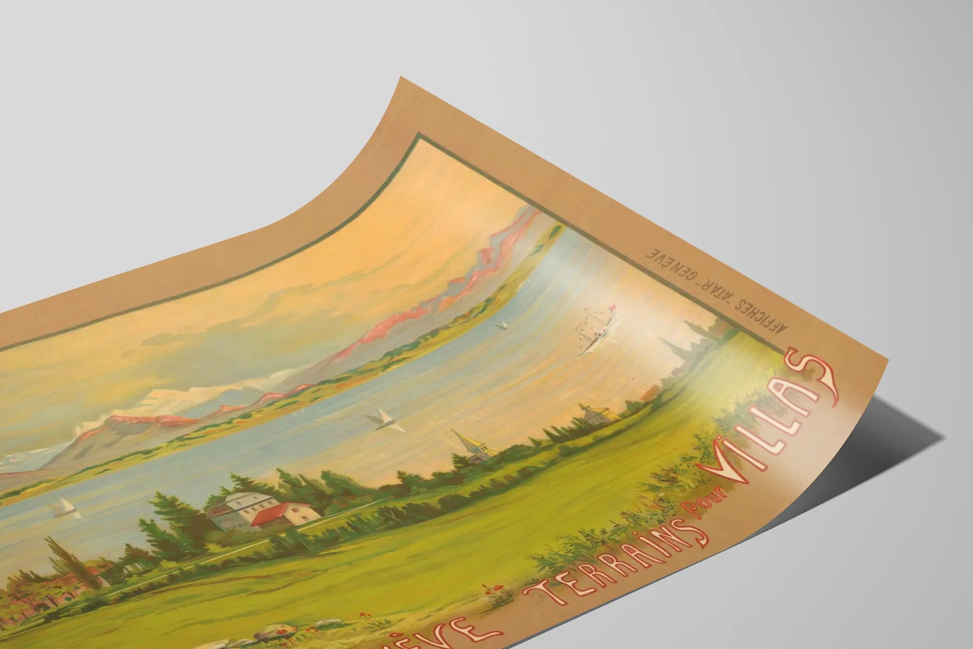 Ta vintage plakat przedstawia malowniczy pejzaż Versoix, urokliwej miejscowości niedaleko Genewy, ukazując teren przeznaczony pod budowę willi. Ta dekoracja ścienna uchwyca uspokajający widok z rozległym zielonym obszarem na pierwszym planie, idealnym do realizacji projektów nieruchomościowych, oraz panoramę jeziora, na którym unoszą się kilka żaglówek i parowiec, podkreślając spokojną i prestiżową atmosferę miejsca. W tle widoczny jest łańcuch gór z ośnieżonymi szczytami, dodający wizualnej głębi i majestatycznego charakteru kompozycji. Ta plakat wyróżnia się klasycznym stylem artystycznym, jednocześnie delikatnym i kolorowym, przywołującym ponadczasowy urok tradycyjnych pejzaży szwajcarskich. Ręcznie napisany tekst w czerwonych i białych literach podkreśla przekaz handlowy tego starego ogłoszenia, akcentując możliwość nabycia terenu w atrakcyjnej okolicy blisko Genewy. Jako dekoracja ścienna, ta vintage plakat jest doskonała, aby dodać elegancki i nostalgiczyczny akcent do salonu, biura lub przestrzeni recepcyjnej, szczególnie dla miłośników dekoracji nawiązujących do dziedzictwa i naturalnego piękna regionów alpejskich. Ten obraz na ścianę harmonijnie wkomponuje się w wnętrze poszukujące atmosfery zarówno klasycznej, jak i przytulnej, oferując otwarte spojrzenie na spokojne życie nad jeziorem Léman. Plakat może również zainteresować pasjonatów lokalnej historii i starożytnej urbanistyki, dzięki swojemu informacyjnemu i estetycznemu charakterowi. Dzięki wysokiej jakości wizualnej i sugestywnemu tematowi, ten element dekoracji ściennej stanowi oryginalny wybór do personalizacji przestrzeni z nutą charakteru i autentyczności.