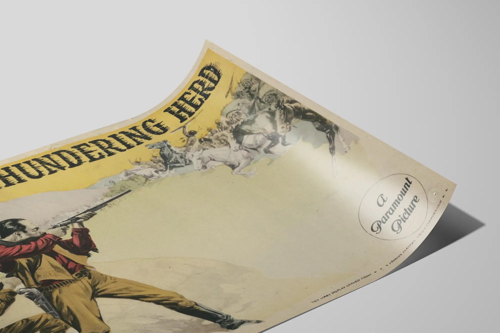 Typografia tytułu „The Thundering Herd” w czarnych, lekko postarzonych wielkich literach, oraz nazwisko „Zane Grey”, słynnego autora powieści westernowych, podkreślają vintage’owy i tematyczny charakter plakatu, wzmacniając jego autentyczność i urok.