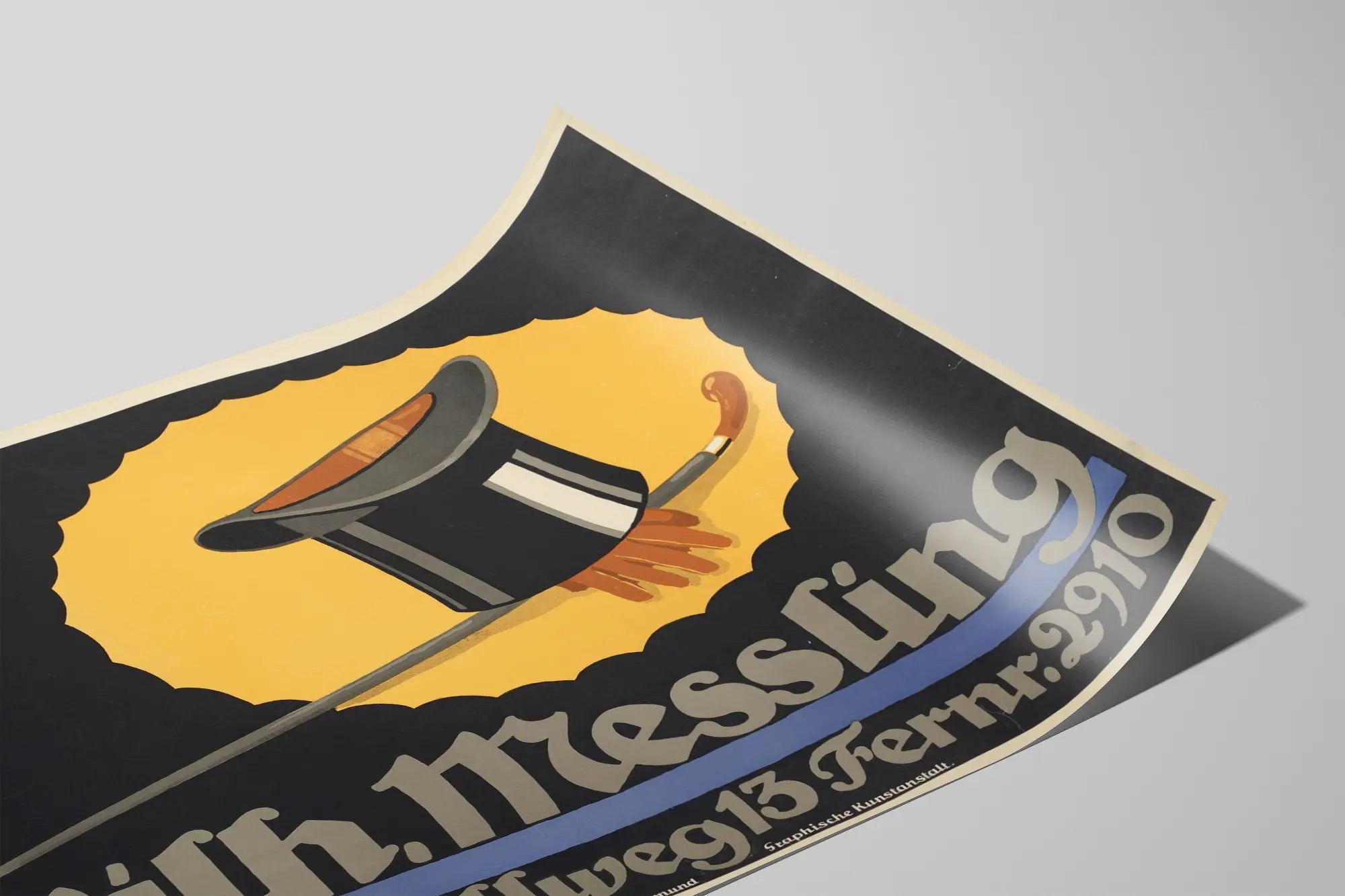 Ta vintage plakat przedstawia odważną kompozycję graficzną z czarnym cylindrem, uzupełnionym laską, obie stylizowane w stonowanych kolorach na jaskrawym żółtym tle, otoczonym czarnym cieniem. Ta fascynująca dekoracja ścienna przyciąga wzrok kontrastem i charakterystycznym stylem graficznym retro, typowym dla klasycznych plakatów reklamowych. Tekst w gotyckim kroju pisma informuje „Wilh. Messling” oraz adres „Ostenhellweg 13” z numerem telefonu, dodając autentycznego i historycznego uroku tej kreacji. Idealna dla miłośników retro dekoracji ściennych, ta plakieta doskonale wpasowuje się w wnętrza o vintage'owym charakterze, wnosząc odrobinę elegancji i oryginalności. Niezależnie od tego, czy w salonie, biurze czy sklepie, ten dekoracyjny plakat przyciąga uwagę i zachęca do zanurzenia się w atmosferze minionych czasów. Połączenie cylindra i laski symbolizuje klasycznego i wyrafinowanego ducha, który z pewnością oczaruje pasjonatów graficznego designu i starej sztuki reklamowej. Dzięki dominującym kolorom czarnemu, żółtemu i odrobinom szarości, ta plakieta łatwo dopasuje się do różnych stylów dekoracji, dodając odrobinę wyrafinowania i historii. To doskonały wybór, aby wzbogacić swoją kolekcję plakatów lub ozdobić ścianę z wyczuciem i oryginalnością.