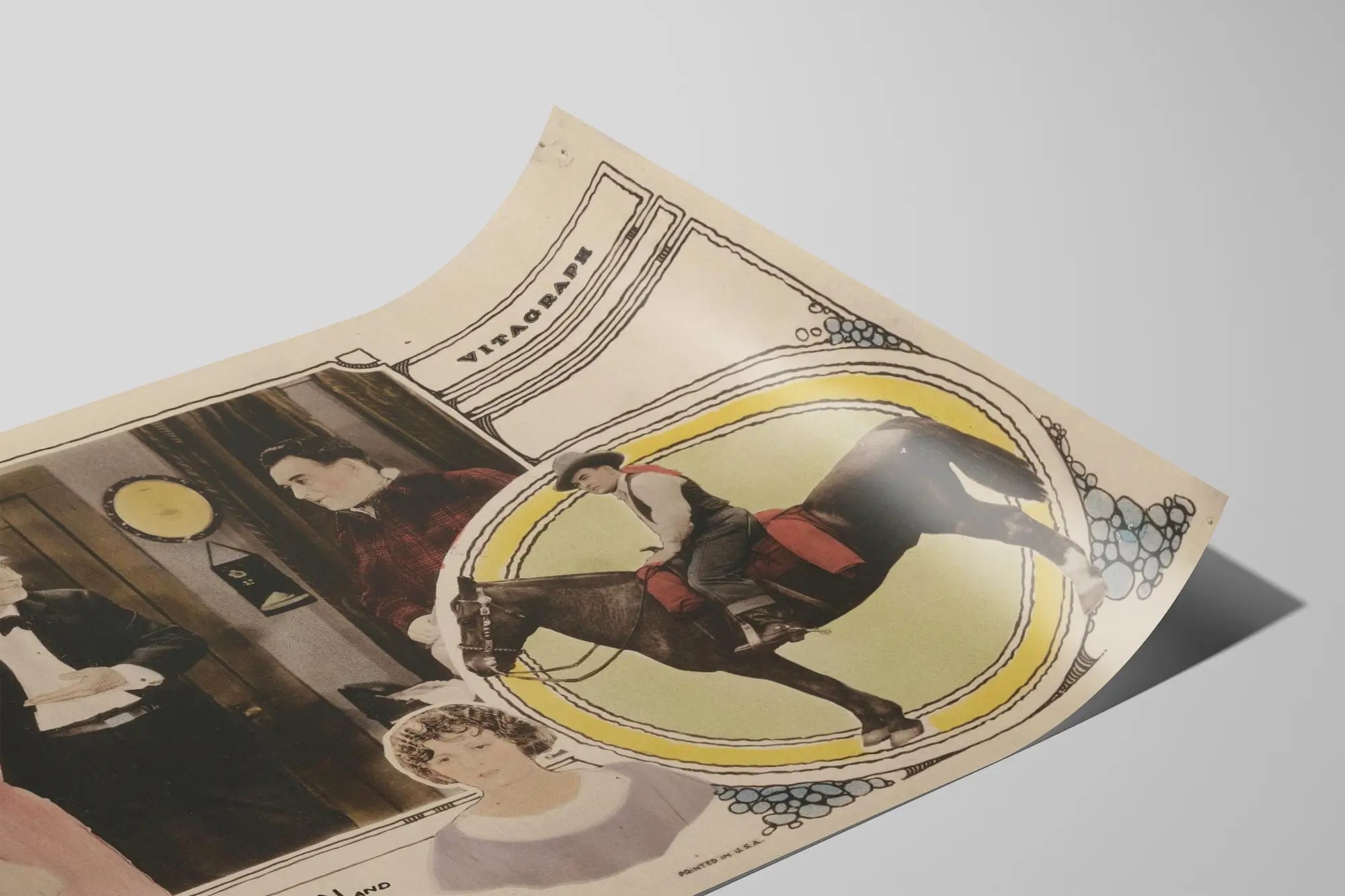 Ta vintage plakat przedstawia scenę z filmu „Playing It Wild” z Williamem Duncanem i Edith Johnson. Ta dekoracja ścienna o staroświeckim uroku jest idealna dla miłośników klasycznego kina lub stylu retro. Na plakacie widać kilka postaci: mężczyznę na koniu w stroju kowboja oraz innych bohaterów w kostiumach z epoki, sugerujących westernową lub dramatyczną fabułę.
