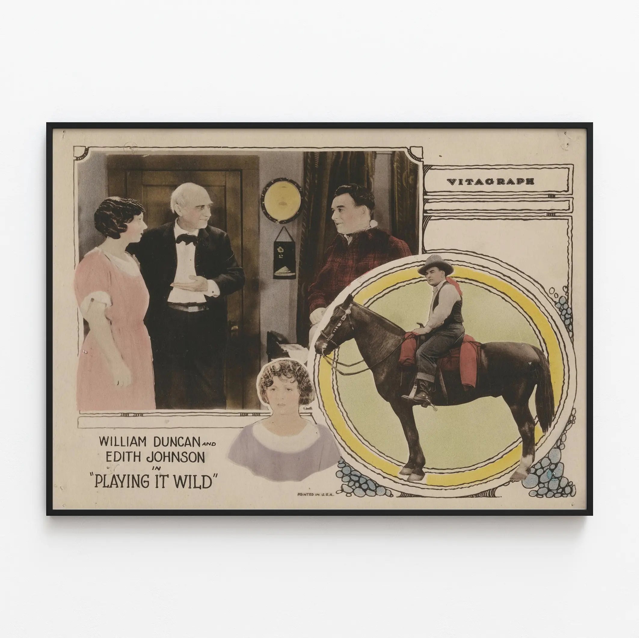 Kompozycja tego plakatu łączy kolorową fotografię z początku XX wieku z ozdobną ramą typową dla dawnych plakatów filmowych. Detale takie jak ozdobne krawędzie i pastelowe kolory nadają temu obrazowi autentyczny charakter, który doskonale wpisuje się w dekorację ścienną nawiązującą do historii amerykańskiego kina. Tekst „William Duncan and Edith Johnson in Playing It Wild” wyraźnie wskazuje tytuł filmu i głównych aktorów, podkreślając kolekcjonerski charakter tego plakatu.