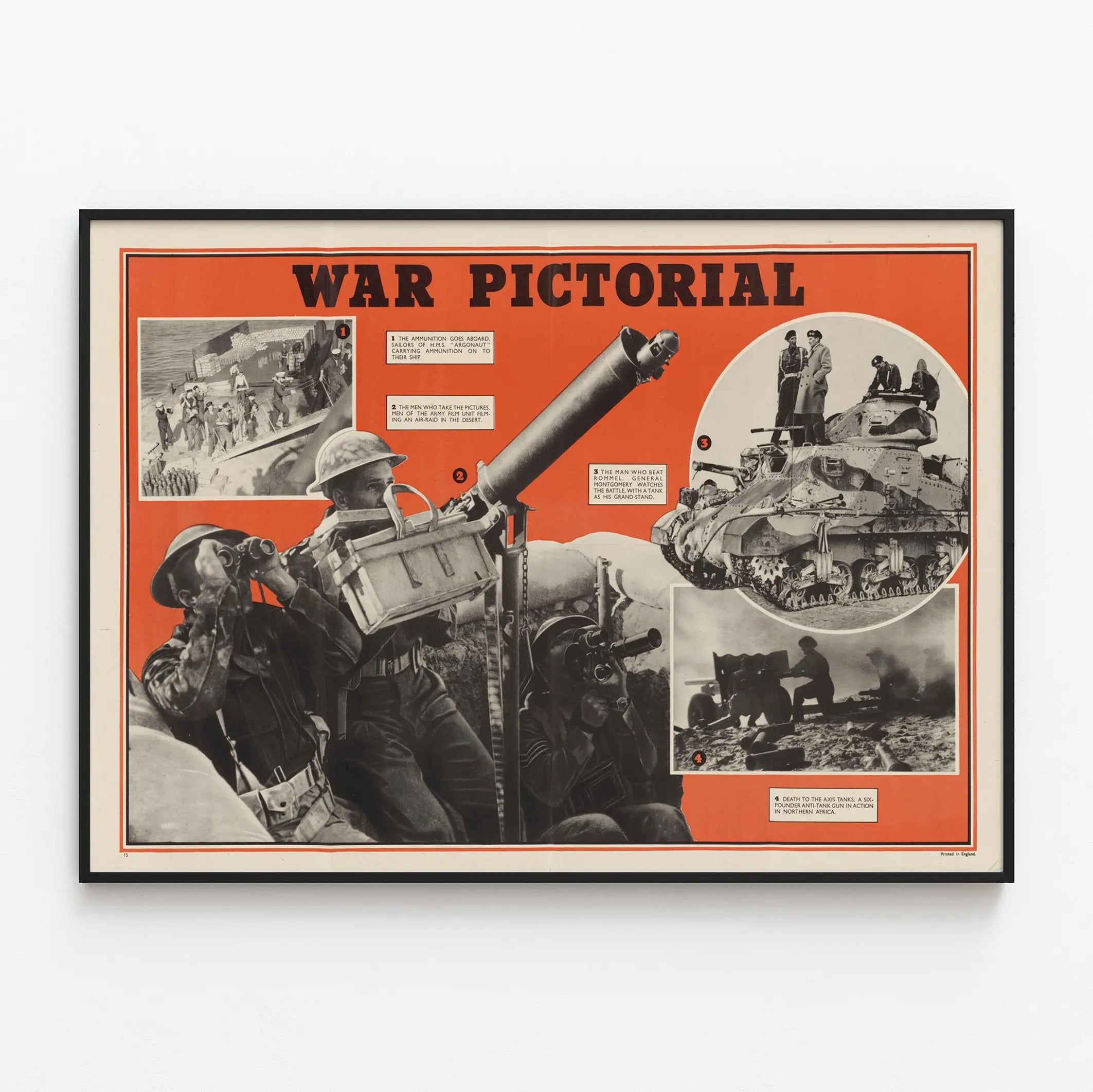 Wybierz ten plakat „War Pictorial”, aby wzbogacić swoją dekorację ścienną o przedmiot zarówno estetyczny, jak i pełen wyrazu. Ten historyczny plakat harmonijnie wpisze się w industrialny, vintage lub tematyczny świat dzięki stonowanym tonacjom i minimalistycznemu designowi. To niezbędny element dla pasjonatów historii, sztuki graficznej i aranżacji wnętrz, którzy chcą połączyć kulturę wizualną z unikalną atmosferą.