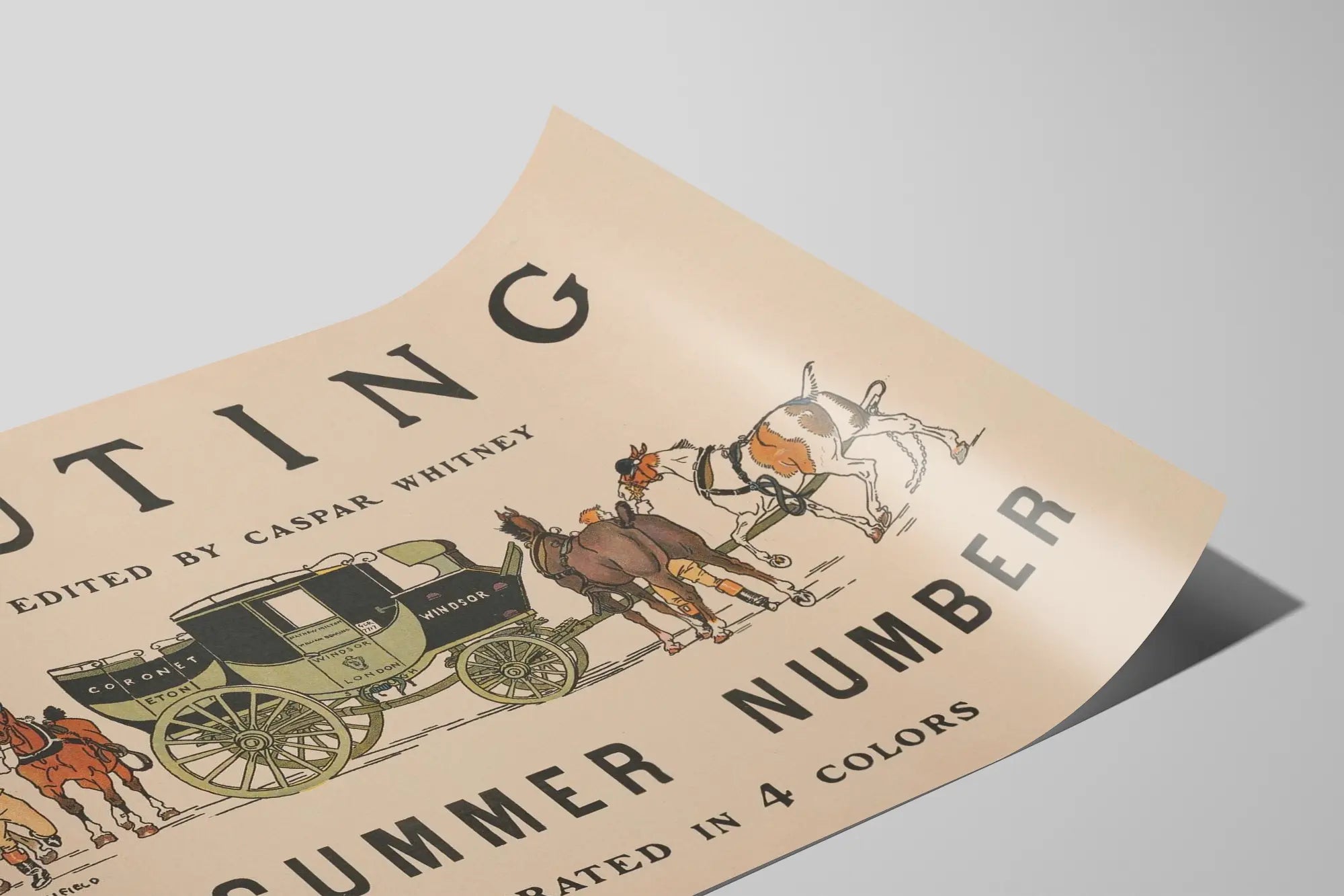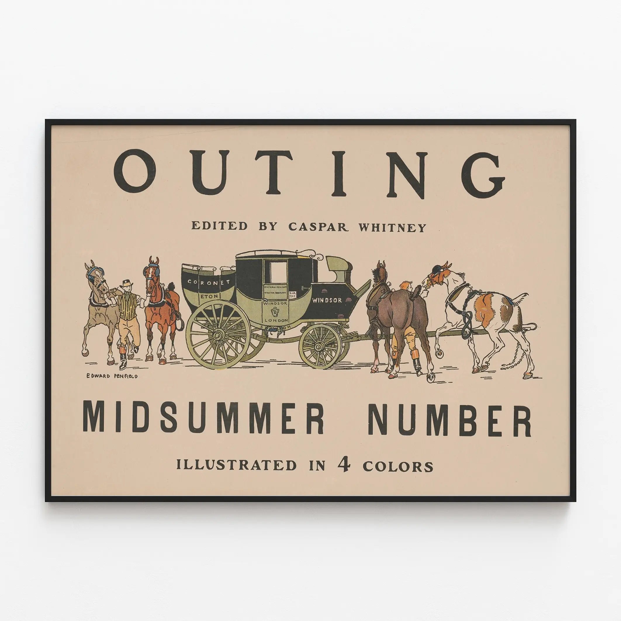 Ta plakat vintage zatytułowana „Outing Midsummer Number”, wydana przez Caspar Whitney, jest unikalnym elementem dekoracji ściennej, który doda Twojemu wnętrzu odrobinę retro uroku. Ilustracja przedstawia powóz zaprzężony w cztery konie, towarzyszący dwóm woźnicom, w precyzyjnym i kolorowym stylu graficznym. Paleta ograniczona do czterech kolorów podkreśla szczegóły powozu ozdobionego napisami takimi jak „Coronet Eton” i „Windsor London”, umożliwiając harmonijne wkomponowanie w różne aranżacje. Podpisana przez Edwarda Penfielda, artystę znanego z jego starych plakatów, ta pełna charakteru grafika jest idealna jako plakat do oprawy. Doskonała dla miłośników starych plakatów i klasycznej, eleganckiej dekoracji ściennej. Idealna do salonu, biura lub biblioteki, ta vintage plakat podkreśli atmosferę pomieszczenia, wprowadzając nostalgiczną i historyczną aurę. Ten obraz na ścianę wyróżnia się staranną grafiką i zrównoważoną kompozycją, co wzmacnia jego walory dekoracyjne. Umieszczając to dzieło w swoim wnętrzu, wprowadzisz artystyczny klimat i odrobinę historii, które zachwycą miłośników wyrafinowanej dekoracji ściennej.