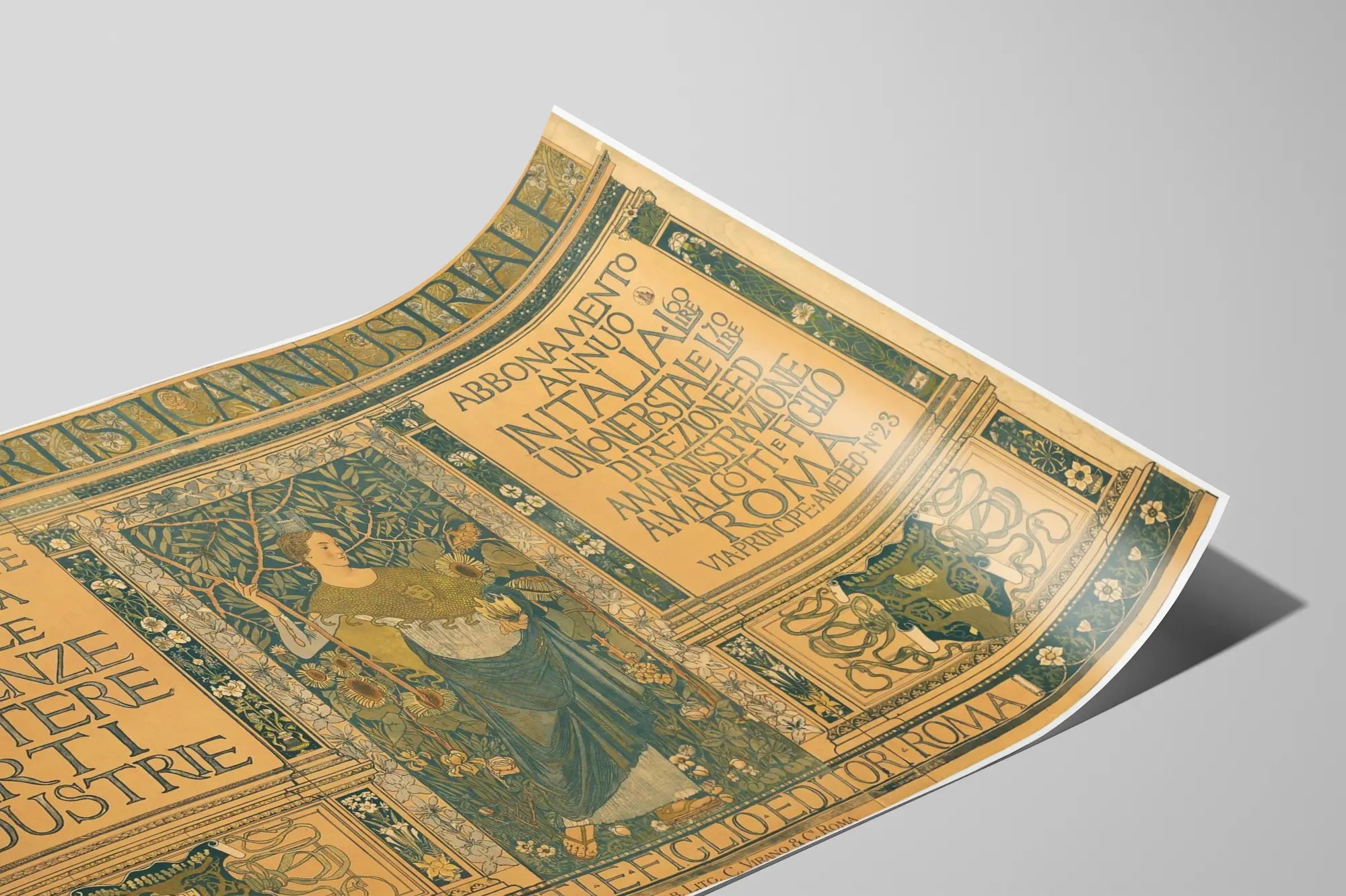 Poznaj tę plakat w stylu vintage, utrzymany w formacie art déco, zatytułowany "Publikacja L'Italia Artistica e Industriale", unikalny element graficzny do Twojej dekoracji ściennej. Ten plakat podkreśla ornamentacyjny styl włoski, z elementami kwiatowymi i motywami architektonicznymi inspirowanymi epoką belle époque. W centrum znajduje się elegancka postać kobieca, otoczona słonecznikami i stylizowanym pejzażem roślinnym, podkreślając harmonię między naturą a sztuką, typową dla dzieł secesyjnych.
