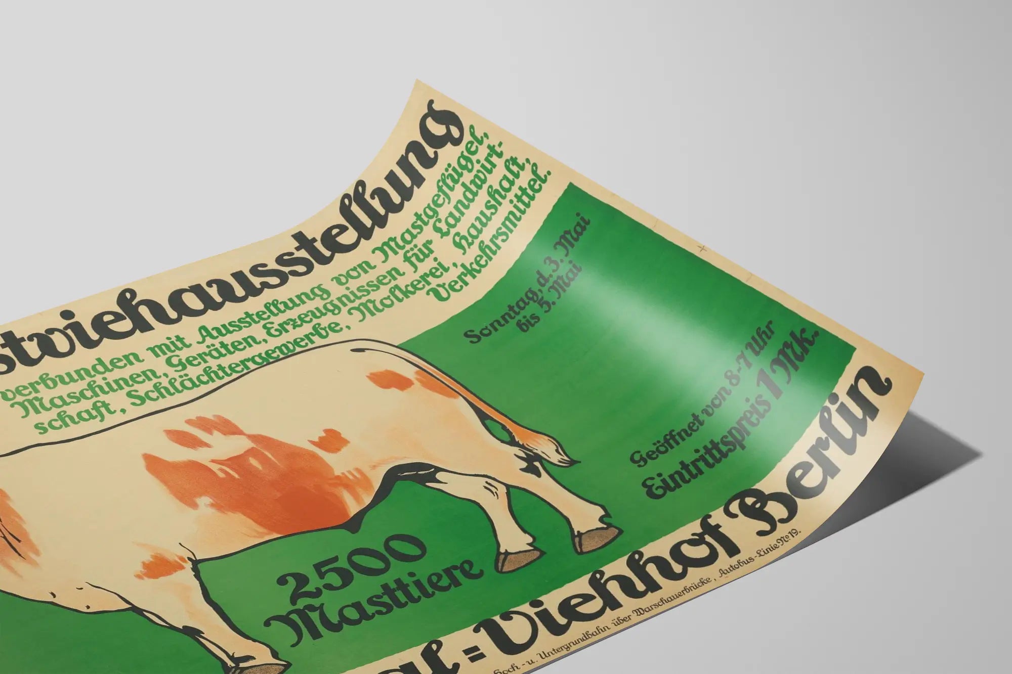 Ta plakatowa reklama vintage promuje 40. wystawę hodowlaną (40. Mastviehausstellung) zorganizowaną w Central-Viehhof w Berlinie. Prezentuje ważne wydarzenie rolnicze, poświęcone prezentacji 2500 zwierząt hodowlanych, zilustrowane rysunkiem ciepłymi barwami byka na zielonym i beżowym tle. Plakat ten zapowiada również wystawy uzupełniające związane z hodowlą drobiu, maszynami rolniczymi, różnorodnym sprzętem i produktami pochodzącymi z rolnictwa, a także z sektorem przetwórstwa spożywczego, handlem mięsem, mleczarstwem, sprzątaniem i środkami transportu. Tekst podający datę wydarzenia informuje, że odbędzie się ono od niedzieli 3 maja do wtorku 5 maja, w godzinach od 8 do 19. Ta plakatowa reklama jest charakterystyczna dla nowoczesnej i popularnej reklamy rolniczej z początku XX wieku w Berlinie, zaprojektowana tak, aby przyciągnąć szeroką publiczność zainteresowaną produkcją rolniczą i innowacjami technicznymi. W dekoracji ściennej doskonale sprawdzi się dla miłośników starych plakatów i tematyki rolniczej, wnosząc do wnętrza nutę retro i autentyczności. Prosty styl graficzny i starannie opracowana typografia czynią z niej element dekoracyjny, który może wzbogacić wnętrze lub lokal o historyczny i kulturowy aspekt związany z rolnictwem i hodowlą. Ten plakat jest idealny jako oryginalna dekoracja ścienna w salonie, izbie wystawowej na wsi, biurze rolniczym lub miejscu przyjęć turystycznych. Jasna kompozycja z wyraźnym kontrastem między ilustracjami a tekstem ułatwia czytanie i przyciąga uwagę. Stanowi mocny element dekoracyjny dla każdej kolekcji starych plakatów, tematycznych plakatów rolniczych lub promujących wydarzenia i wystawy wiejskie. Ta ścienna dekoracja łączy estetykę z historią, oferując jednocześnie silną wartość tożsamościową związaną z dziedzictwem rolniczym Berlina.