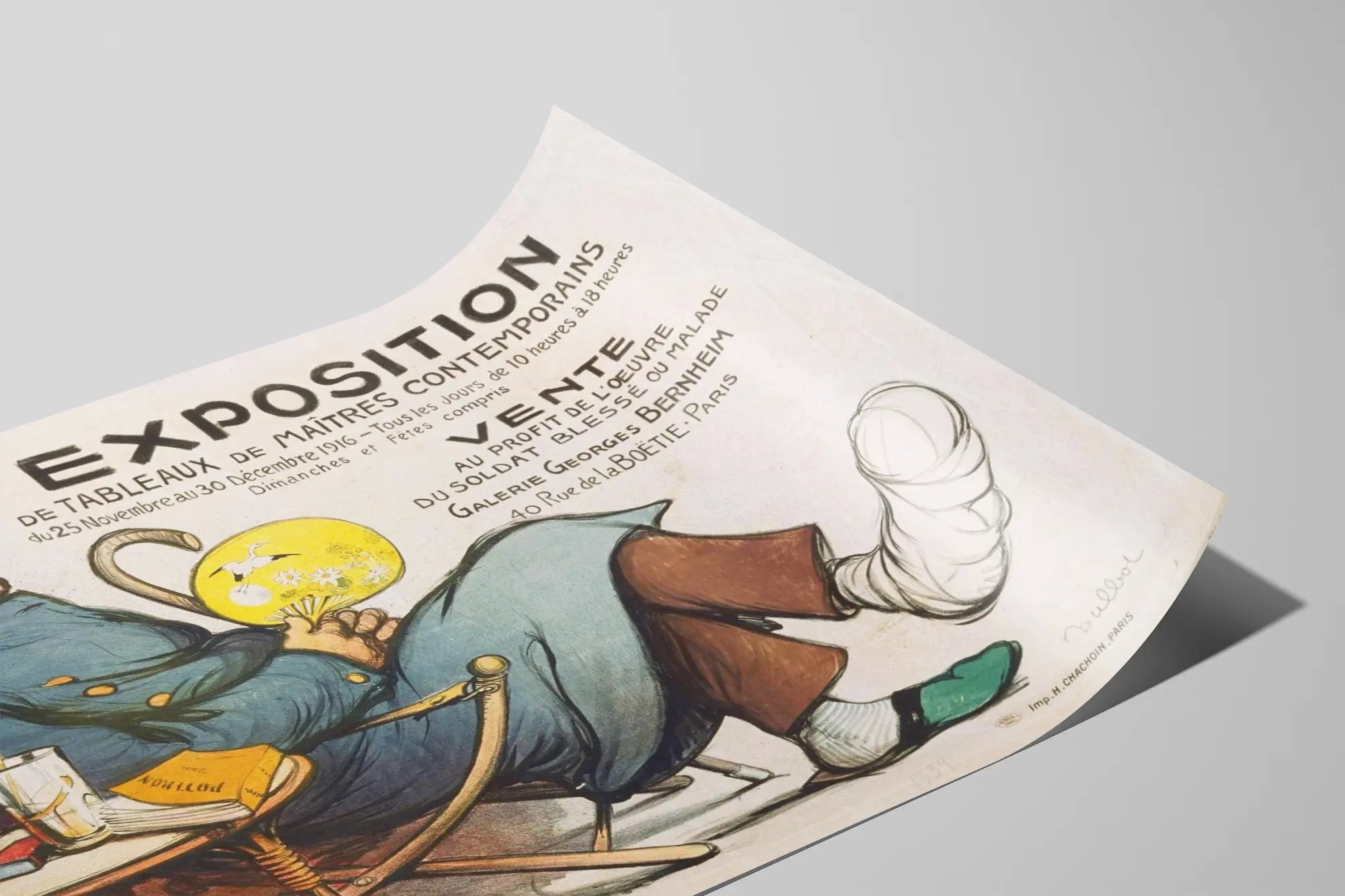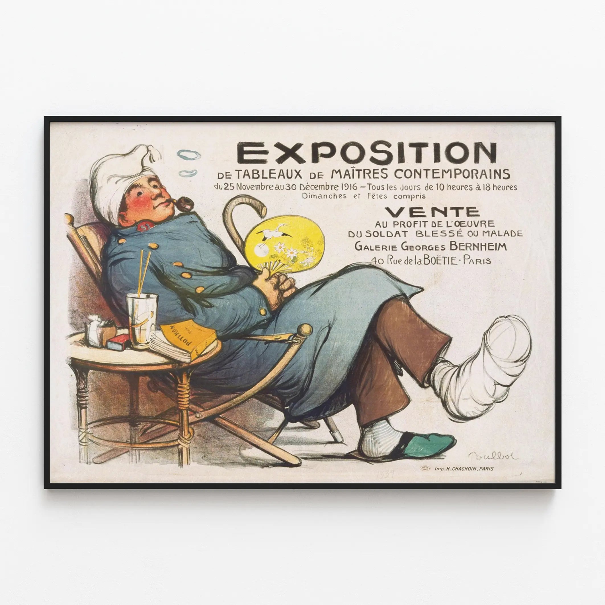 Odkryj tę wyjątkową plakat vintage, zapowiadający wystawę obrazów mistrzów współczesnych, zorganizowaną w Paryżu w 1916 roku. Ten plakat reklamowy wyróżnia się szczegółową ilustracją przedstawiającą rannego żołnierza, siedzącego na fotelu, symbol działalności charytatywnej na rzecz rannych lub chorych żołnierzy. Wydarzenie miało miejsce w Galerie Georges Bernheim, pod adresem 40 rue de la Boétie, miejscu ikonicznym dla miłośników sztuki i dekoracji ściennych początku XX wieku.