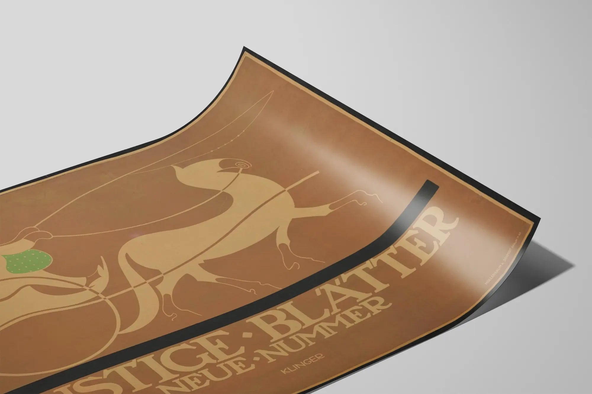 Odkryj tę vintage'ową plakat zatytułowany "Lustige Blätter", unikalny element dla każdego miłośnika dekoracji ściennych w stylu art déco. Ten plakat wyróżnia się minimalistyczną i stylową grafiką przedstawiającą konia zaprzęgniętego do dorożki z dwoma postaciami. Ilustracja wykonana jest w tonacji brązów i beżów, z akcentem zieleni na torbie woźnicy, co nadaje łagodną i retro atmosferę, idealnie komponującą się z każdym wnętrzem poszukującym starego, eleganckiego uroku.
