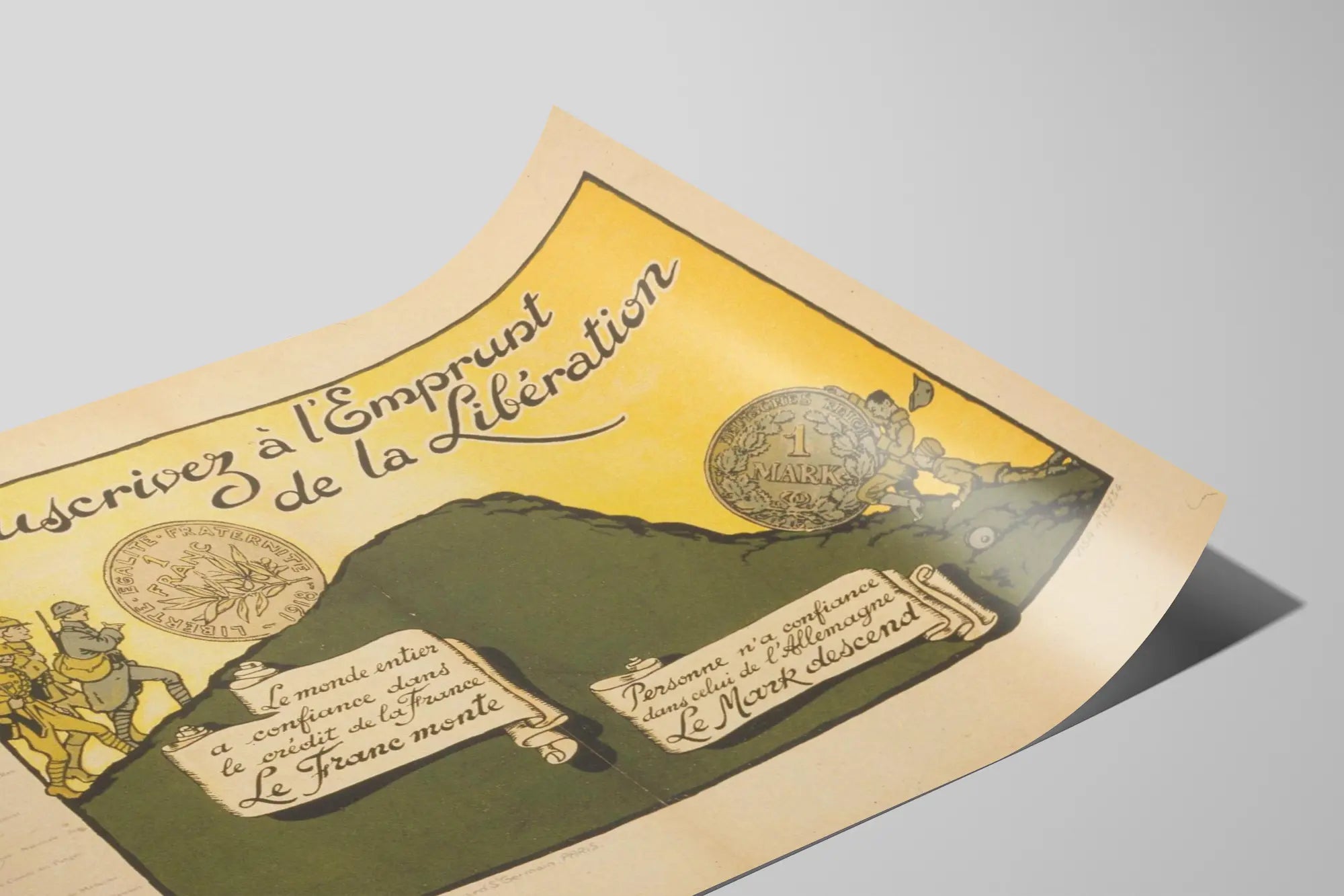 Centralny motyw przedstawia stylizowaną górę, na której dwóch niemieckich żołnierzy próbuje zepchnąć monetę przedstawiającą niemiecką markę. W kontraście, trzech francuskich żołnierzy zmierza ku szczytowi, symbolizując wzrost wartości franka francuskiego, jako znak nadziei i zaufania. Dwie flagi wkomponowane w rysunek zawierają ręcznie pisane napisy: „Cały świat ufa kredytowi Francji. Frank rośnie” oraz „Nikt nie ufa niemieckiemu. Marka spada”.