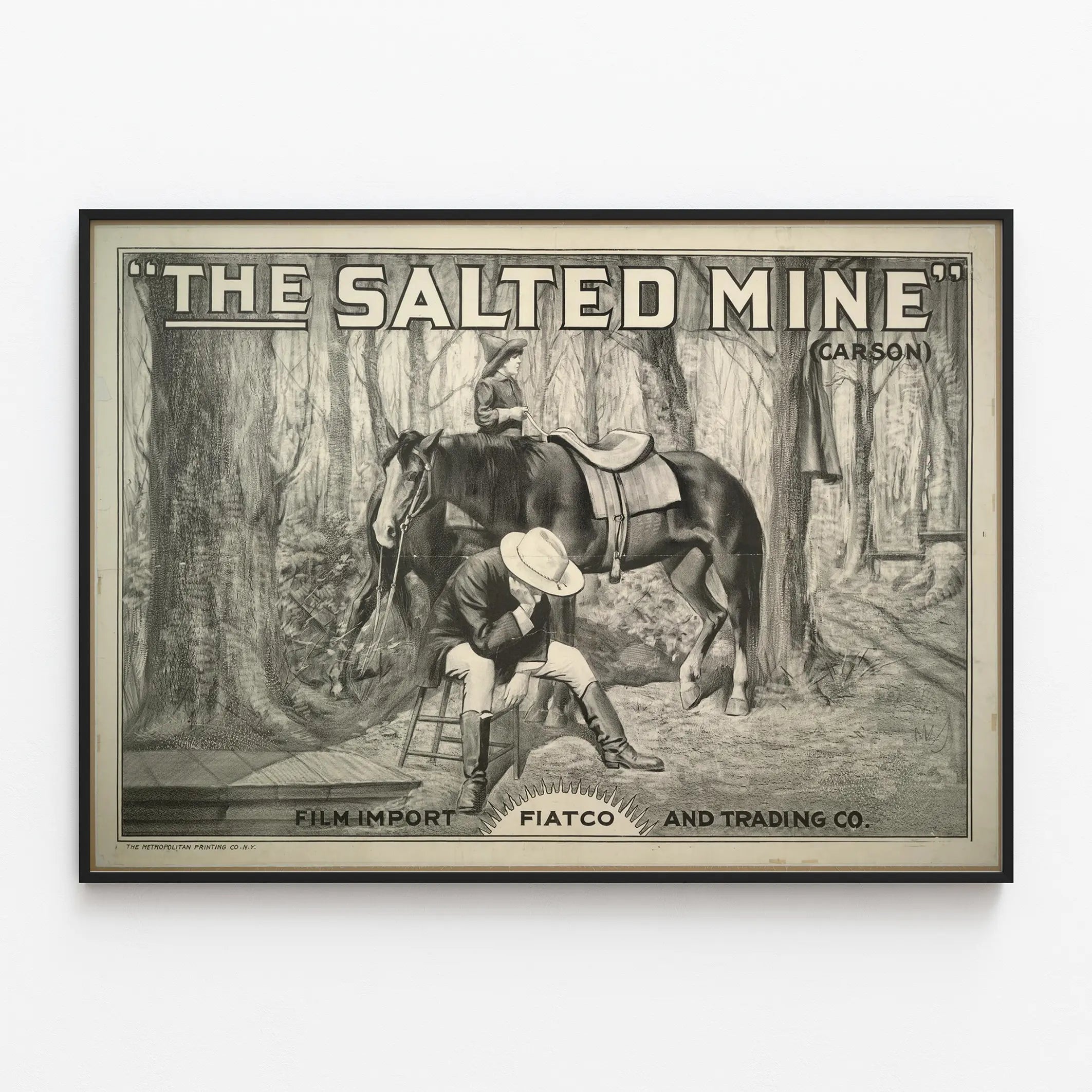 Wprowadź odrobinę autentyczności i historycznego uroku do swojego wnętrza dzięki tej plakatowi vintage zatytułowanemu „The Salted Mine”. Ta dekoracja ścienna w czerni i bieli uchwyca ikoniczną scenę z Dzikiego Zachodu, przedstawiając mężczyznę siedzącego na stołku, z głową opartą na ręce, w postawie medytacyjnej obok konia z towarzyszącą mu kobietą na grzbiecie. Ten plakat, inspirowany westernem, wywołuje atmosferę jednocześnie nostalgicznej i dramatycznej, idealną dla miłośników amerykańskiej historii i scen naturalnych. Wydrukowany przez The Metropolitan Printing Co. New York, wyróżnia się precyzją ilustracji, która skupia się na odcieniach ołówka, oferując szczegółowe detale krajobrazu leśnego w tle, a także postaci i konia. Jego graficzny styl w czerni i bieli czyni go dyskretnym i eleganckim elementem dekoracyjnym, który doskonale wpasuje się zarówno w salon, gabinet, jak i przestrzeń tematyczną poświęconą kinu lub przygodom z dawnych czasów. Umieszczenie napisu „The Salted Mine” wielkimi, pogrubionymi literami na górze plakatu dodaje efektu retro i dramatyzmu, podkreślając jego estetykę vintage. Ta unikalna sztuka nawiązuje również do firm importujących filmy (Film Import Fiatco and Trading Co.), dodając dodatkowy wymiar historyczny tej ściennej dekoracji. Dla oryginalnej dekoracji ściennej, ten vintage’owy wyświetlacz doskonale skomponuje się z elementami z drewna lub skóry, typowymi dla dekoracji westernowych, tworząc ciepłą i autentyczną atmosferę. Niezależnie od tego, czy to kolekcja plakatów, inspiracja kinem czy dekoracja tematyczna, plakat „The Salted Mine” zapewnia silne wrażenie wizualne oraz ponadczasowy styl, ceniony przez miłośników autentycznej dekoracji ściennej.