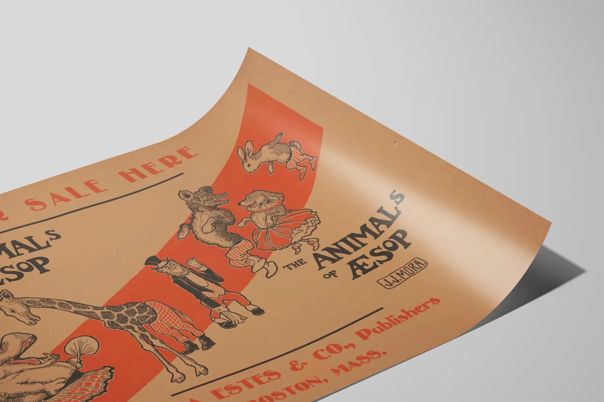 Plakat jest oprawiony w przekątną, pomarańczową taśmę, która ożywia czarno-biały motyw i skupia uwagę na postaciach zwierzęcych. Tekst „For Sale Here” oraz nazwa wydawcy „Dana Estes & Co., Publishers Boston, Mass.” podkreślają staroświecki charakter tego dzieła. Idealny do vintage’owej dekoracji ściennej, ten plakat doskonale sprawdzi się jako kontrastowy element w salonie, pokoju dziecięcym lub bibliotece, wnosząc odrobinę fantazji, oryginalności i nutę historii.