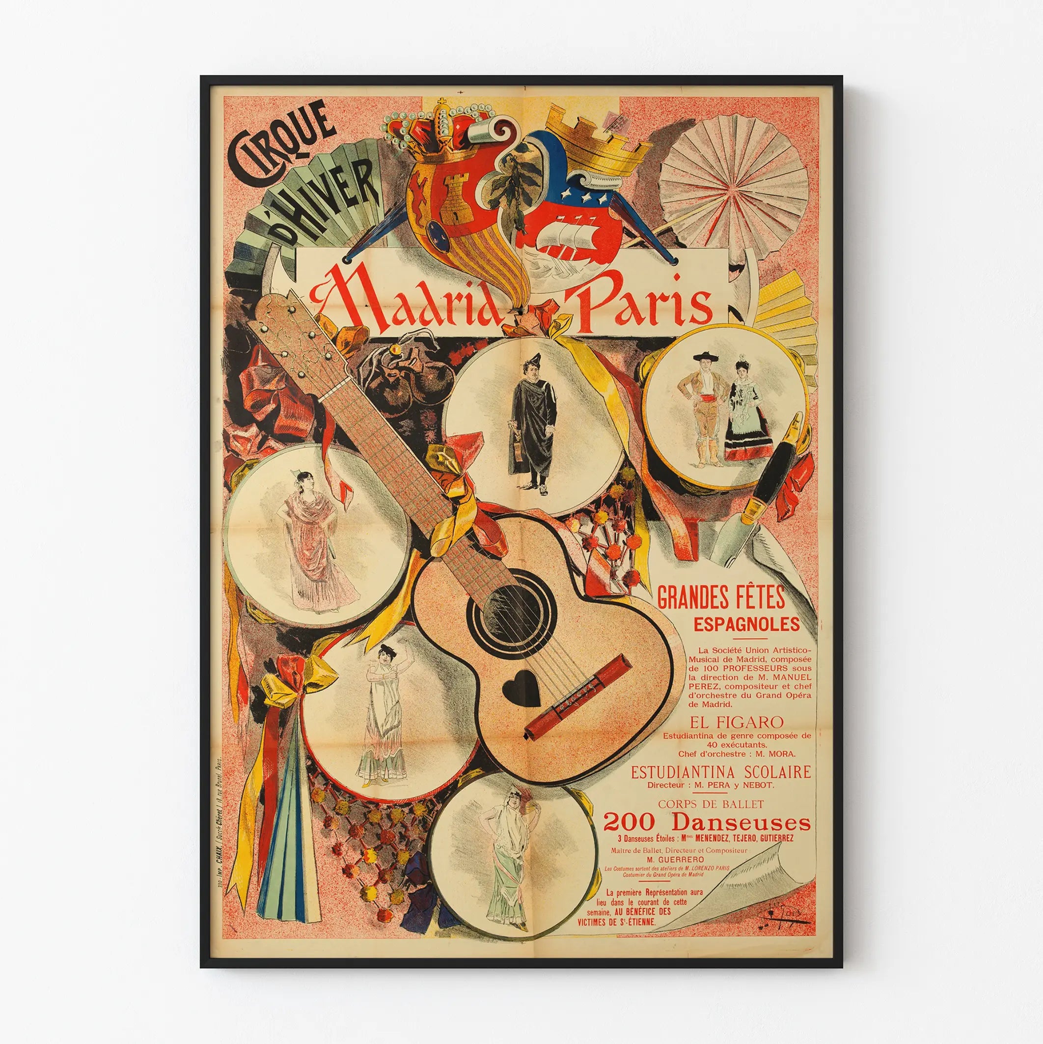 Ta vintage plakat Cirque d'Hiver przedstawia wydarzenie kulturalne zatytułowane „Madryt Paryż Wielkie Fiesta Hiszpańskie”, pełne szczegółów wizualnych i artystycznych. Ukazuje ilustrację skoncentrowaną wokół klasycznej gitary ozdobionej wielokolorowymi wstęgami, symbolizującą związek między muzyką a tradycyjnym tańcem hiszpańskim, które wyznaczają rytm tych wielkich świąt. Pięć okrągłych medalionów otacza gitarę, z których każdy przedstawia postacie ubrane w tradycyjne stroje hiszpańskie, odpowiadające różnym tańcom lub rolom artystycznym, wzmacniając tym samym folklorystyczną i świąteczną atmosferę.
