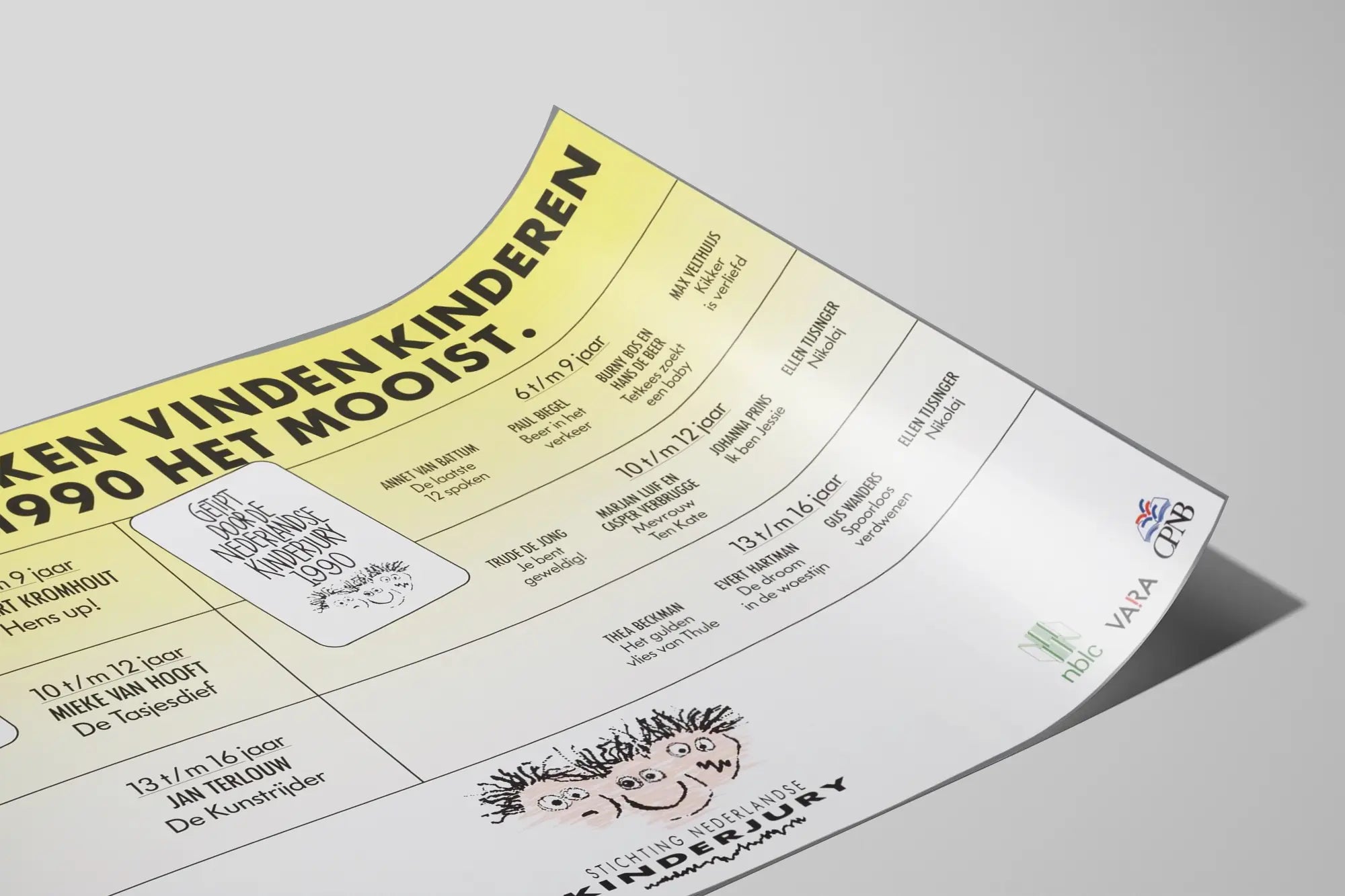 Ta plakat vintage przedstawia ulubione książki dzieci z 1990 roku, wybrane przez holenderski jury dziecięce. Stanowi unikalną dekorację ścienną, która zachwyci zarówno kolekcjonerów, jak i miłośników literatury młodzieżowej oraz stylu retro. Kompozycja podzielona jest na cztery sekcje odpowiadające określonym grupom wiekowym: 6 do 9 lat, 10 do 12 lat oraz 13 do 16 lat. Każda sekcja zawiera tytuły książek i nazwiska autorów, którzy wywarli wpływ na tamte czasy, z wyróżnieniem oficjalnego uznania przez jury. Tło w odcieniu żółtego, przechodzące w biały, dodaje jasności i podkreśla kontrastową czarną typografię. Plakat zawiera także loga holenderskich instytucji związanych z literaturą młodzieżową, co wzmacnia jego autentyczność i charakter vintage.