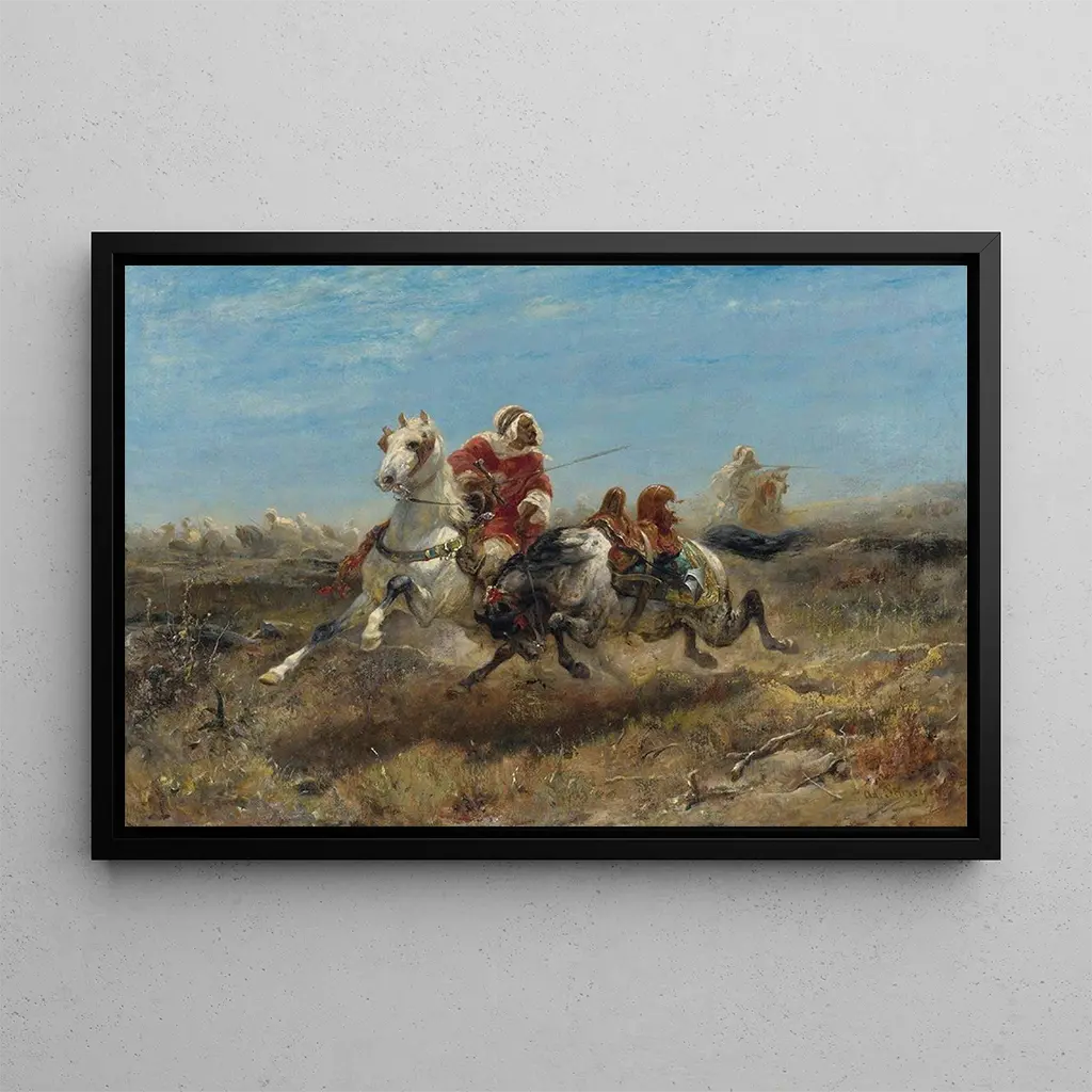 La Chasse : obraz dzikiej przyrody W "La Chasse" Adolf Schreyer przenosi nas w serce ożywionej sceny, gdzie dzika natura ukazuje się w pełnej krasie. Zwierzęta, uchwycone w momencie napięcia, są przedstawione z niezwykłą precyzją, podczas gdy otaczający krajobraz, bogaty w szczegóły, wywołuje atmosferę jednocześnie dynamiczną i majestatyczną. Kolory ziemiste i odcienie zieleni tworzą uderzający kontrast, wzmacniając intensywność sceny. To dzieło zaprasza do pełnej immersji w świat fauny, gdzie każdy spojrzenie odsłania nową stronę dzikiego życia. Adolf Schreyer : virtuoz malarstwa zwierząt Adolf Schreyer, aktywny w XIX wieku, jest uznawany za wyjątkowego talentu w przedstawianiu zwierząt i krajobrazów. Pod wpływem romantyzmu, potrafił uchwycić surowe piękno natury, jednocześnie wplatając elementy narracyjne w swoje dzieła. Schreyer podróżował po Europie i Afryce Północnej, czerpiąc inspirację z scen polowań i dzikiej przyrody, które obserwował. Jego realistyczne podejście i dbałość o szczegóły czynią go ważną postacią w dziedzinie malarstwa zwierząt, pozostawiając trwałe dziedzictwo w historii sztuki. Ekscytująca dekoracyjna reprodukcja z wieloma atutami Reprodukcja obrazu "La Chasse" to fascynujący dodatek do każdej kolekcji sztuki, wprowadzający odrobinę dzikiej natury do Twojej przestrzeni życiowej. Niezależnie od tego, czy zawisnie w salonie, biurze czy pokoju zabaw, ta płótno przyciąga wzrok i budzi podziw. Jakość druku i wierne oddanie oryginału gwarantują imponujący efekt wizualny. Z dynamiczną atmosferą i bogatymi kolorami, ta reprodukcja z pewnością wzbogaci Twoją dekorację, celebrując piękno fauny i natury.