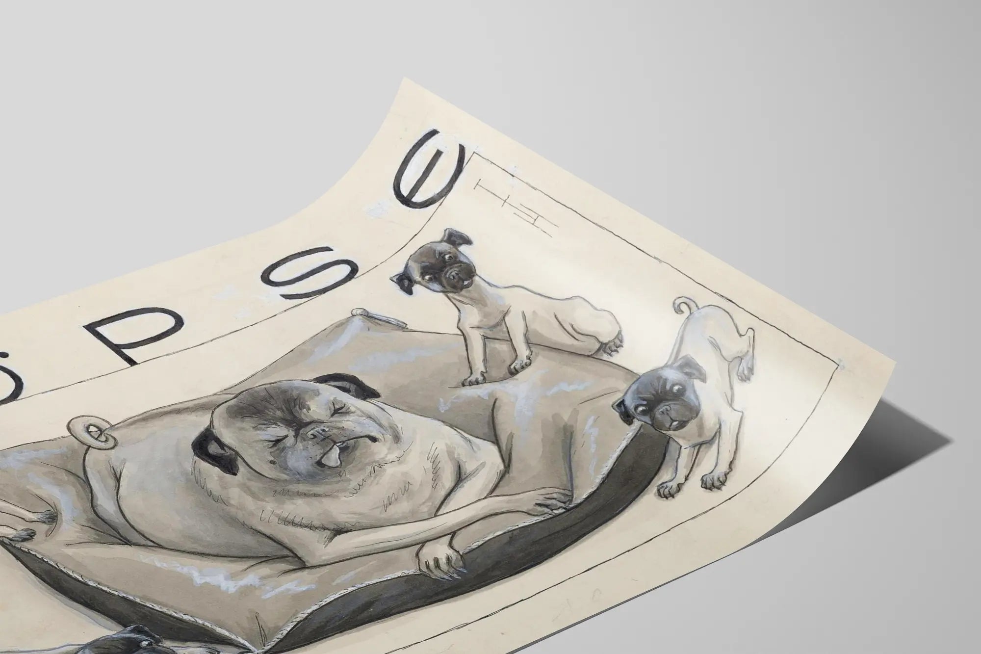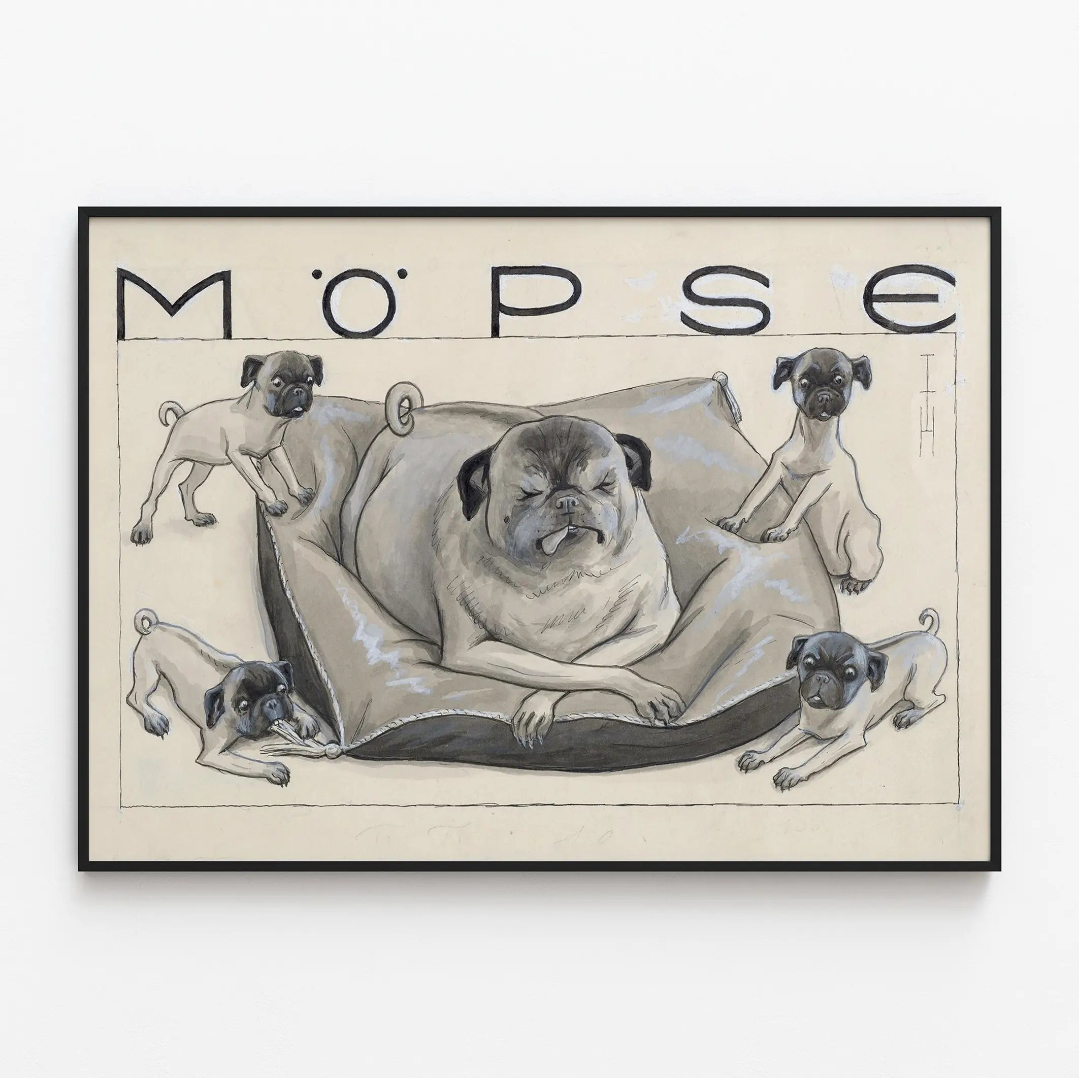 Dodaj odrobinę humoru i czułości do swojego wnętrza dzięki tej dekoracyjnej plakacie przedstawiającej psa rasy mops leżącego na dużym poduszce, otoczonego przez cztery małe szczenięta. Ten unikalny obrazek gra na zabawnych wyrazach twarzy psów, z mopsikiem w centrum, który wygląda komicznie zadowolony, z lekko wystawionym językiem i zamkniętymi oczami, podczas gdy jego szczenięta przyjmują różne, zabawne i dynamiczne pozy wokół niego. Delikatny rysunek podkreśla jasnobeżową i ciemnobrązową sierść psów, harmonijnie kontrastując z jasnym tłem i subtelnymi cieniami, które podkreślają trójwymiarowość poduszki i miękkość futra. Słowo „Mops” zapisane na górze plakatu wskazuje rasę psa w języku niemieckim, dodając oryginalny i retro charakter graficzny do plakatu. Ta dekoracja ścienna jest idealna dla miłośników psów i tych, którzy chcą wprowadzić do swojego wnętrza ciepłą, nietuzinkową i pełną czułości atmosferę. Łatwa do dopasowania do różnych stylów wnętrz, od klasycznego po nowoczesny, ta plakata doskonale sprawdzi się w salonie, sypialni czy biurze, wnosząc radosny i przyjazny nastrój. Lekka i dyskretna, przyciąga uwagę swoją unikalną artystyczną ekspresją i naiwnym urokiem, który zachwyca zarówno dzieci, jak i dorosłych. Ta ścienna dekoracja to doskonały wybór, aby spersonalizować swoje wnętrze motywem wesołego i wzruszającego psa, łącząc humor, delikatność i staranną estetykę.