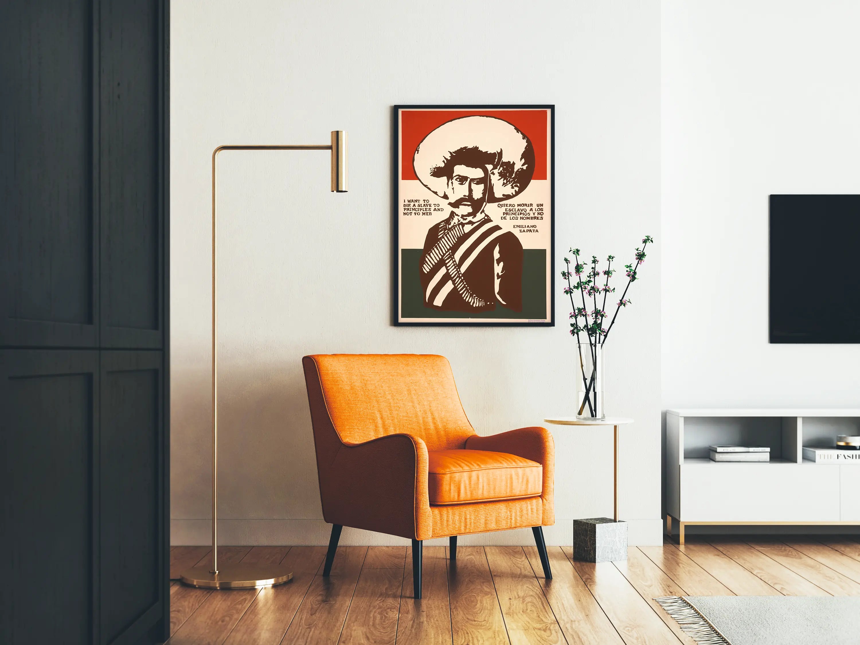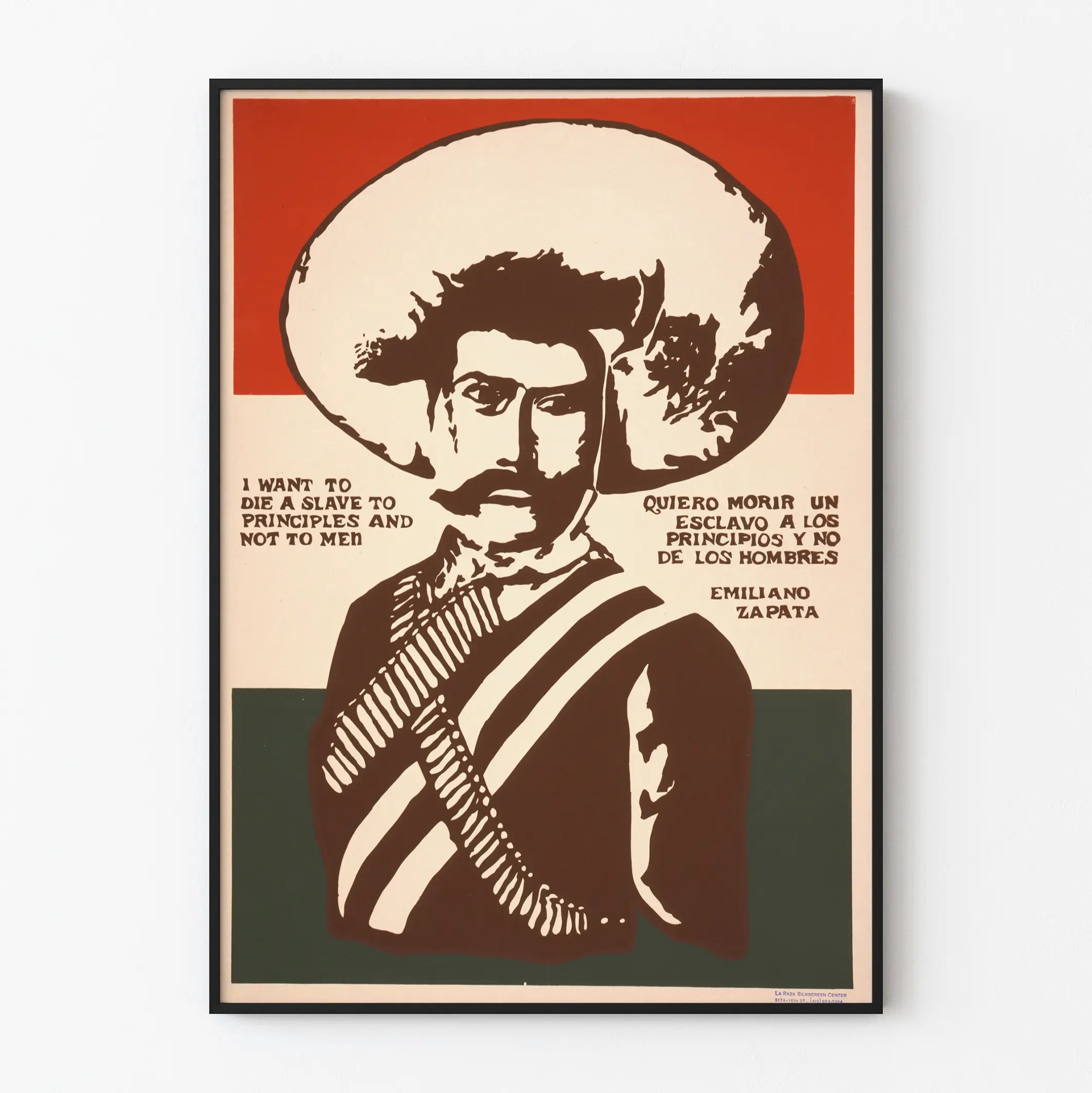 Ten plakat dekoracyjny na ścianę przedstawia stylizowaną, ciemno-brązową ilustrację postaci noszącej szeroki tradycyjny meksykański kapelusz i pas z nabojami, nawiązując do ikonicznego obrazu meksykańskiego rewolucjonisty Emiliano Zapaty. Tło składa się z poziomych pasów w kolorze czerwonym i ciemnozielonym, które przypominają barwy meksykańskiej flagi, dodając temu elementowi silny wymiar kulturowy. Po lewej i prawej stronie postaci znajdują się dwie inskrypcje wielkimi literami, w języku angielskim i hiszpańskim: „I want to die a slave to principles and not to men” oraz „Quiero morir un esclavo a los principios y no de los hombres”. Cytat ten podkreśla ideę lojalności wobec zasad, a nie ludzi, głosząc mocne przesłanie moralnej przekonania i uczciwości. Ten plakat jest idealny do wnętrza, które pragnie połączyć sztukę, historię i inspirację. Jego prosty, kontrastowy styl graficzny czyni go wyrazistym elementem, doskonałym na ścianę w salonie, biurze lub pokoju do nauki. Dostosowując się do różnych stylów dekoracyjnych, ten plakat może równie dobrze wpasować się w nowoczesne wnętrza, jak i w bardziej tradycyjne aranżacje. To doskonały wybór dla tych, którzy szukają dekoracji ściennej o głębokim znaczeniu i wyrazistej estetyce, dodając charakteru i refleksji przestrzeni. Ten plakat jest hołdem dla ducha walki i wartości uczciwości, idealny do inspirowania i ozdabiania z autentycznością.