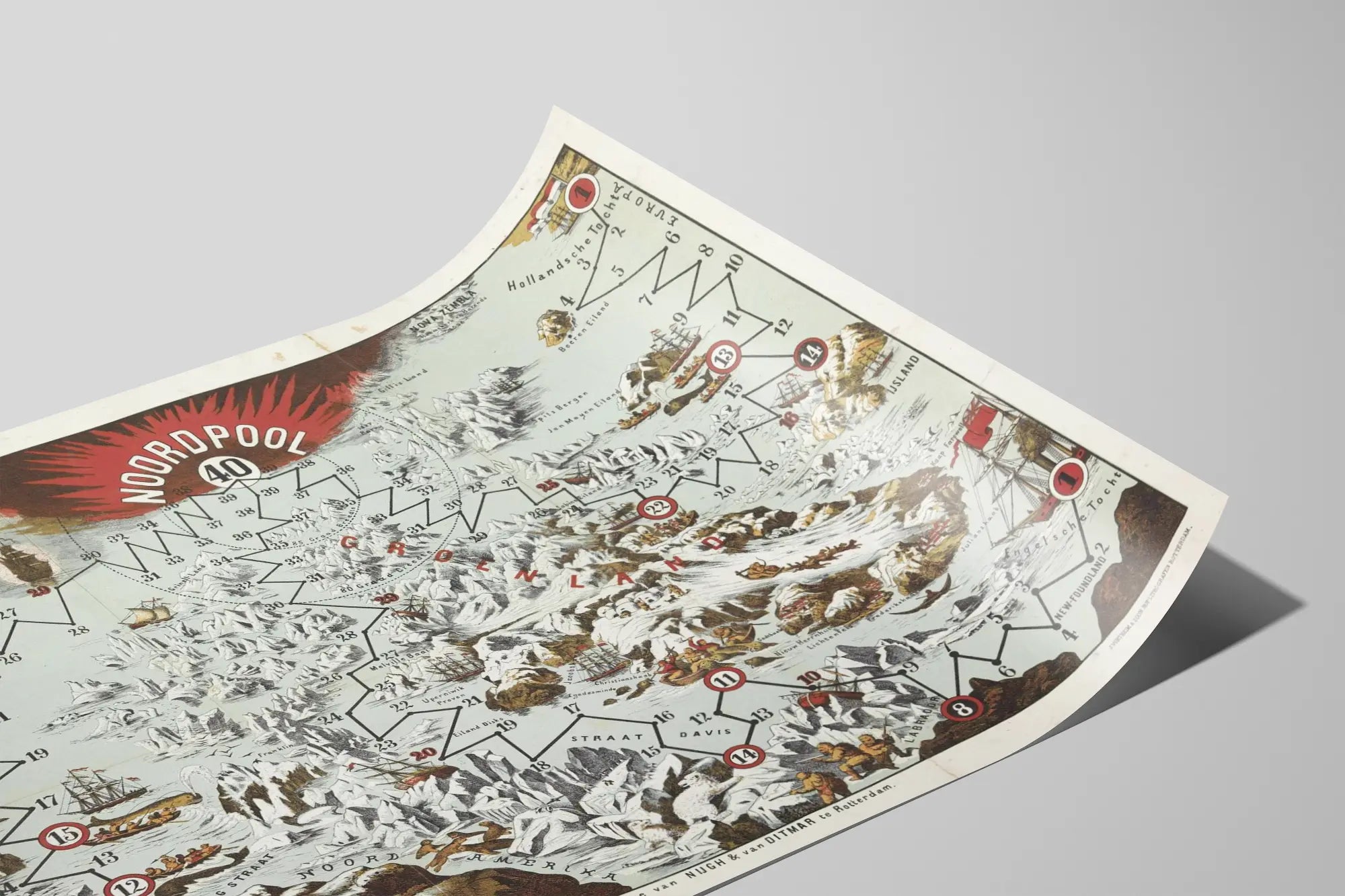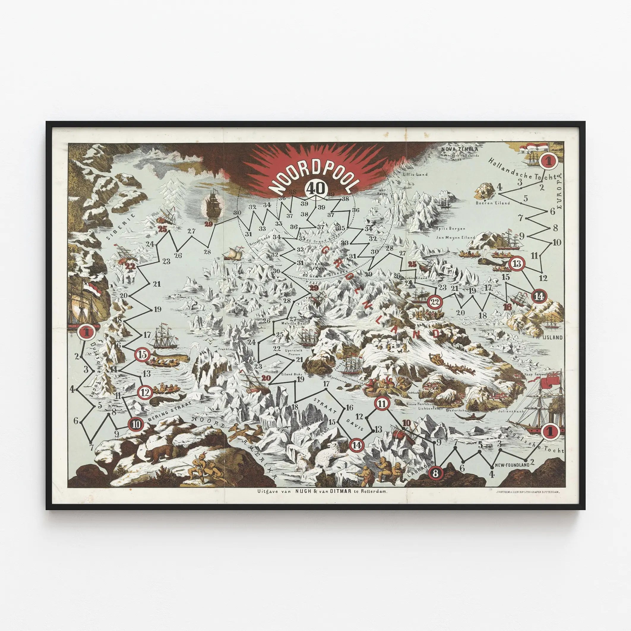 Odkryj tę unikalną reprodukcję przedstawiającą starą mapę Bieguna Północnego, prawdziwy skarb dla miłośników dekoracji ściennych i historii. Ten vintage'owy plakat ilustruje region arktyczny w szczegółowym stylu graficznym, charakterystycznym dla map z przeszłości. Między ośnieżonymi górami, górami lodowymi, żaglówkami i scenami żeglugi, ten obraz na ścianę zapewnia zanurzenie w ekspedycjach polarnych.
