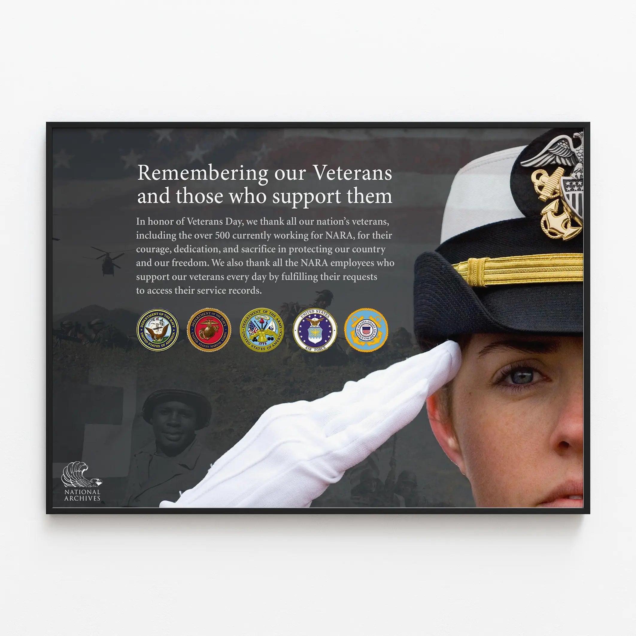 Ten pamiątkowy plakat z okazji Dnia Weterana to unikalny element dekoracji ściennej poświęcony hołdowi dla byłych żołnierzy i osób ich wspierających. Przedstawiający poruszające zdjęcie żołnierki w mundurze salutującej, ten silny element wizualny jest wzmocniony przez tło o poważnym i pełnym szacunku tonie, ukazujące żołnierzy na misji oraz oficjalne emblematy reprezentujące różne gałęzie armii amerykańskiej. Kompozycja plakatu podkreśla przesłanie w języku angielskim, które oddaje hołd odwadze, oddaniu i poświęceniu weteranów, którzy chronią naród i wolność swojego kraju. Plakat wywołuje również uznanie dla oddanych pracowników wspierających weteranów, ułatwiając dostęp do ich akt służbowych. Idealny do dekoracji ściennej o charakterze instytucjonalnym, edukacyjnym lub osobistym, ten plakat wprowadza poważną i pełną szacunku atmosferę w przestrzeniach, w których jest wywieszony. Jego użycie jest doskonałe podczas uroczystości, obchodów lub jako element dekoracyjny mający na celu uświadomienie i przypomnienie o znaczeniu weteranów w społeczeństwie. Oficjalne odznaki przedstawione na dole plakatu dodają autentyczności i podkreślają oficjalny charakter przesłania. Podsumowując, ten ścienny wyświetlacz jest symbolicznym wyborem, aby oddać hołd bohaterom wojskowym, nadać sens dekoracji wnętrza i promować pamięć oraz szacunek poprzez znaczący obraz i zaangażowany tekst.