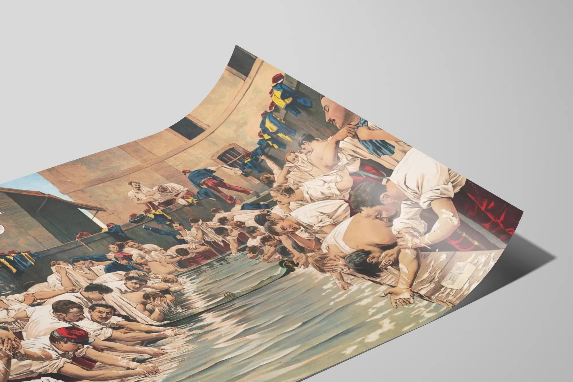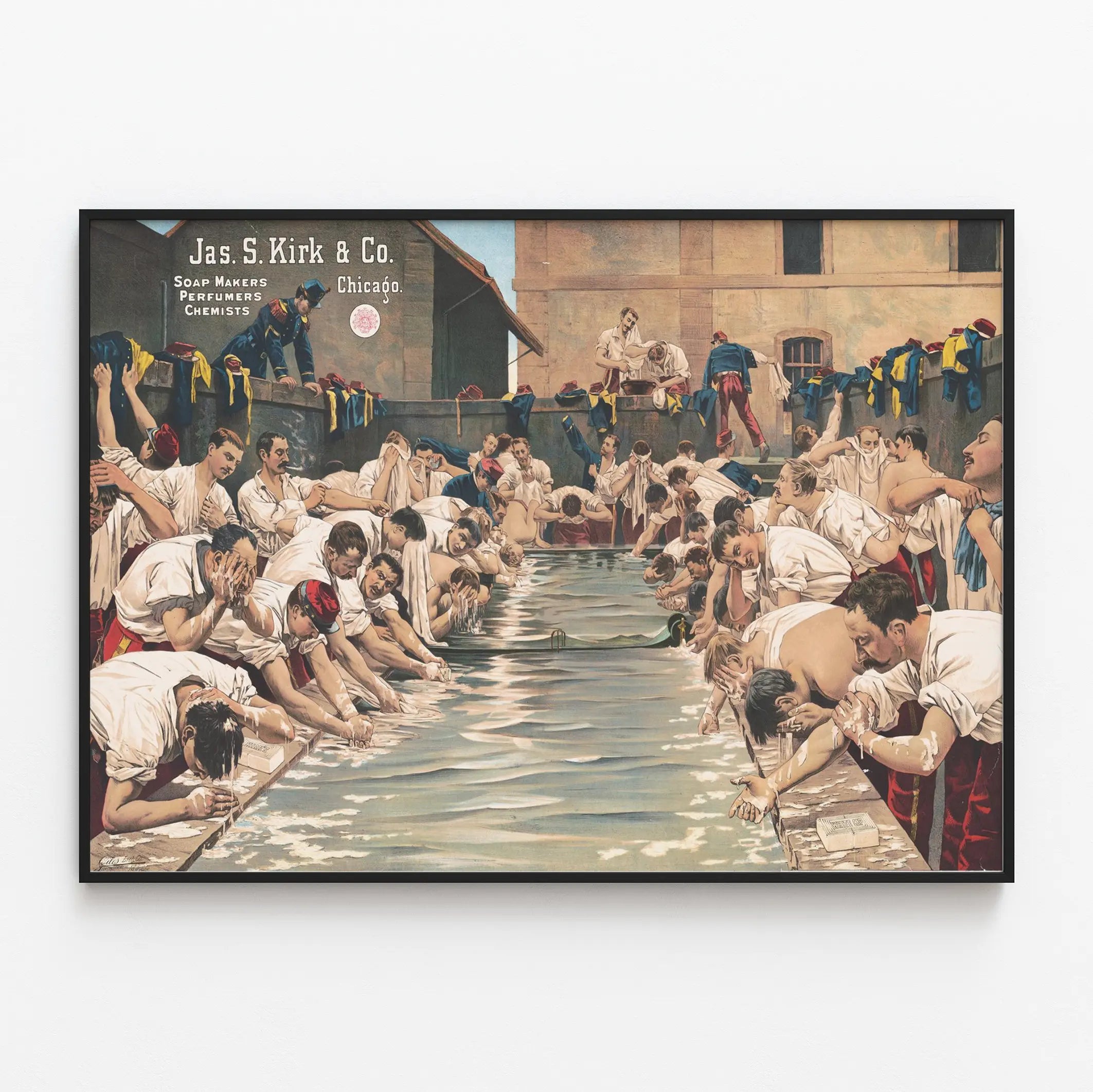 Poznaj tę plakatową reprodukcję vintage przedstawiającą ożywioną i szczegółową scenę, ukazującą grupę mężczyzn myjących się w dużym, zewnętrznym basenie, prawdopodobnie w środowisku instytucjonalnym lub wojskowym. Ta dekoracja ścienna zaprasza do zanurzenia się w minioną epokę, z jej delikatnymi barwami i uderzającym stylem artystycznym, który uchwyca moment wspólnego życia wokół higieny i troski o ciało. Plakat podkreśla napis "Jas. S. Kirk & Co., Soap Makers, Perfumers, Chemists, Chicago", umieszczając scenę w kontekście handlowym i historycznym związanym z tą firmą specjalizującą się w produkcji mydeł, perfum i chemikaliów. To dzieło ścienne stanowi element dekoracji, który zachwyci miłośników retro sztuki i starych ilustracji reklamowych, wnosząc do każdego wnętrza odrobinę autentyczności i historii. Bogate w szczegóły, męskie postacie częściowo ubrane w kolorowe mundury, myją twarze i ręce nad brzegiem wody, podczas gdy inni składają lub rozkładają ubrania na murku. Plakat jest idealny do ozdobienia łazienki, przestrzeni relaksacyjnej lub miejsca komercyjnego, które pragnie przywołać vintage'owy i przemysłowy klimat. To piękna okazja, aby dodać do swojej kolekcji dekoracji ściennych dzieło artystyczne i historyczne. Jego narracyjny charakter i autentyczna atmosfera czynią z tego plakatu estetyczny i pełen wyrazu element dekoracyjny, doskonały do wzbogacenia vintage'owego nastroju o oryginalny i kulturalny akcent.
