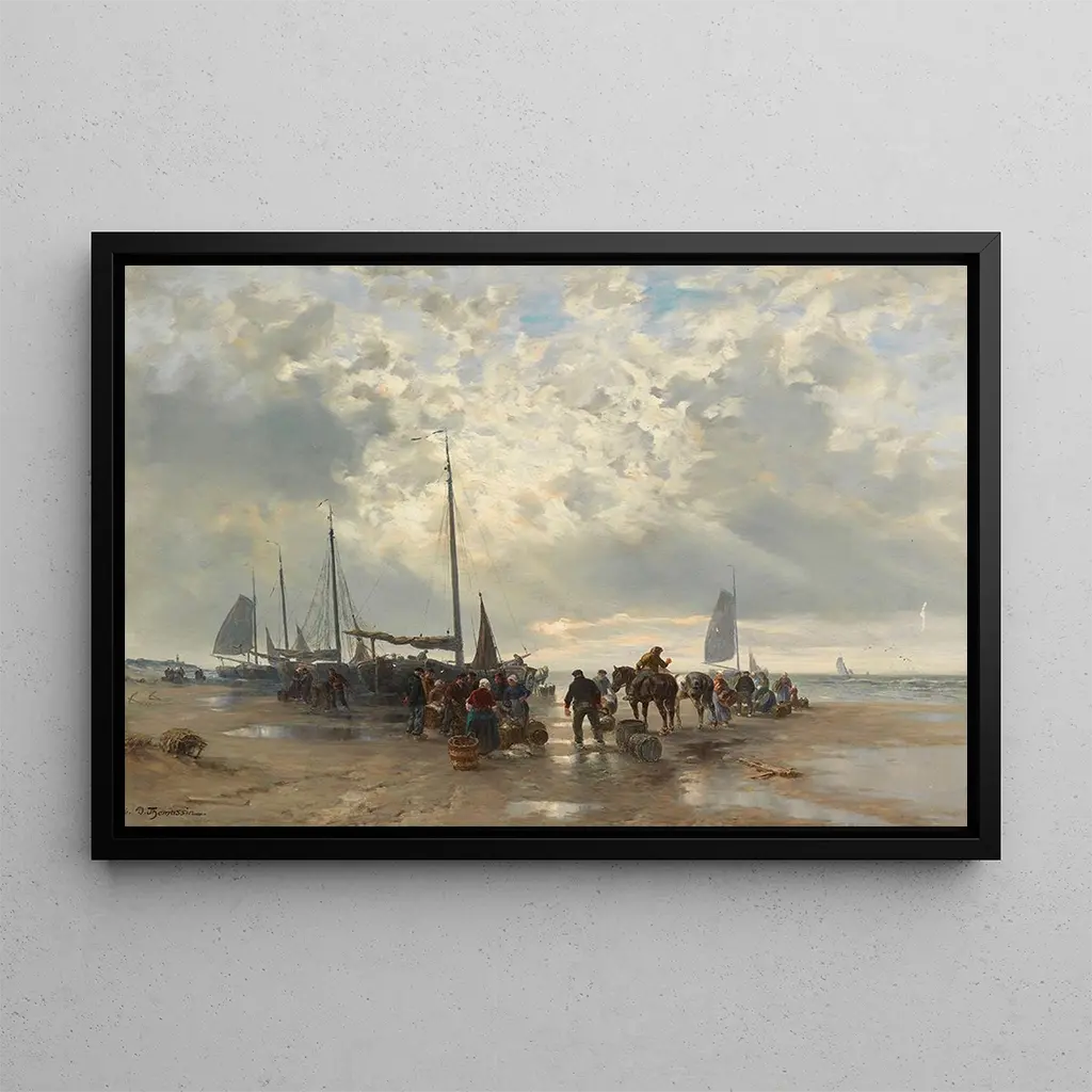 Retour rybaków: scena życia morskiego pełna spokoju W tej reprodukcji obrazu Retour rybaków, artysta Désiré Thomassin uchwycił moment ciszy na brzegu. Delikatne i naturalne kolory, od uspokajających odcieni niebieskiego morza po ciepłe tony piasku, tworzą harmonijną atmosferę. Kompozycja podkreśla rybaków wracających z dnia pracy, ich sylwetki odcinają się na jasnym tle nieba. Technika Thomassina, łącząca realizm i impresjonizm, pozwala poczuć morską bryzę i zapach soli, zachęcając widza do zanurzenia się w tej scenie codziennego życia. Désiré Thomassin: mistrz francuskiego pejzażu morskiego Désiré Thomassin, aktywny w XIX wieku, jest znany z pejzaży morskich, które świadczą o znaczeniu morza w kulturze francuskiej. Pod wpływem wielkich mistrzów swojego czasu, rozwija styl łączący precyzję i poezję. Jego dzieła, często wystawiane na prestiżowych salonach, odzwierciedlają epokę, w której malarstwo pejzażowe przeżywało rozkwit. Thomassin, dzięki swojemu wrażliwemu podejściu i spojrzeniu na życie morskie, przyczynia się do artystycznego dziedzictwa swojego czasu, celebrując piękno francuskich wybrzeży i życie rybaków. Uniwersalny druk artystyczny o wielu zaletach Reprodukcja obrazu Retour rybaków okazuje się idealnym wyborem dekoracyjnym do różnych przestrzeni, takich jak salon, biuro czy nawet sypialnia. Jakość druku zapewnia niezwykłą wierne oddanie szczegółów oryginalnego dzieła, umożliwiając pełne docenienie mistrzostwa artysty. Estetyczny urok tej płótna, z uspokajającymi kolorami i sugestywną sceną, wnosi odrobinę spokoju i elegancji do Twojego wnętrza. Włączając tę reprodukcję do swojej dekoracji, nie tylko zapraszasz sztukę do domu, ale także bogatą i inspirującą historię morską.