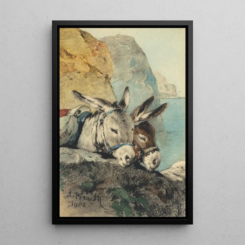 Anton Braith, niemiecki artysta XIX wieku, słynie z przedstawień fauny i flory. Pod wpływem romantyzmu potrafił uchwycić istotę swoich tematów z wyjątkową wrażliwością. Jego kariera była naznaczona podróżami do Włoch, gdzie czerpał inspirację z malowniczych pejzaży i życia wiejskiego. Braith był także pionierem w sztuce zwierzęcej, podkreślając piękno i inteligencję zwierząt w swoich dziełach. Para osiołków, pozdrowienia z jeziora Garda to doskonały przykład jego talentu do tworzenia harmonijnych i poruszających kompozycji.