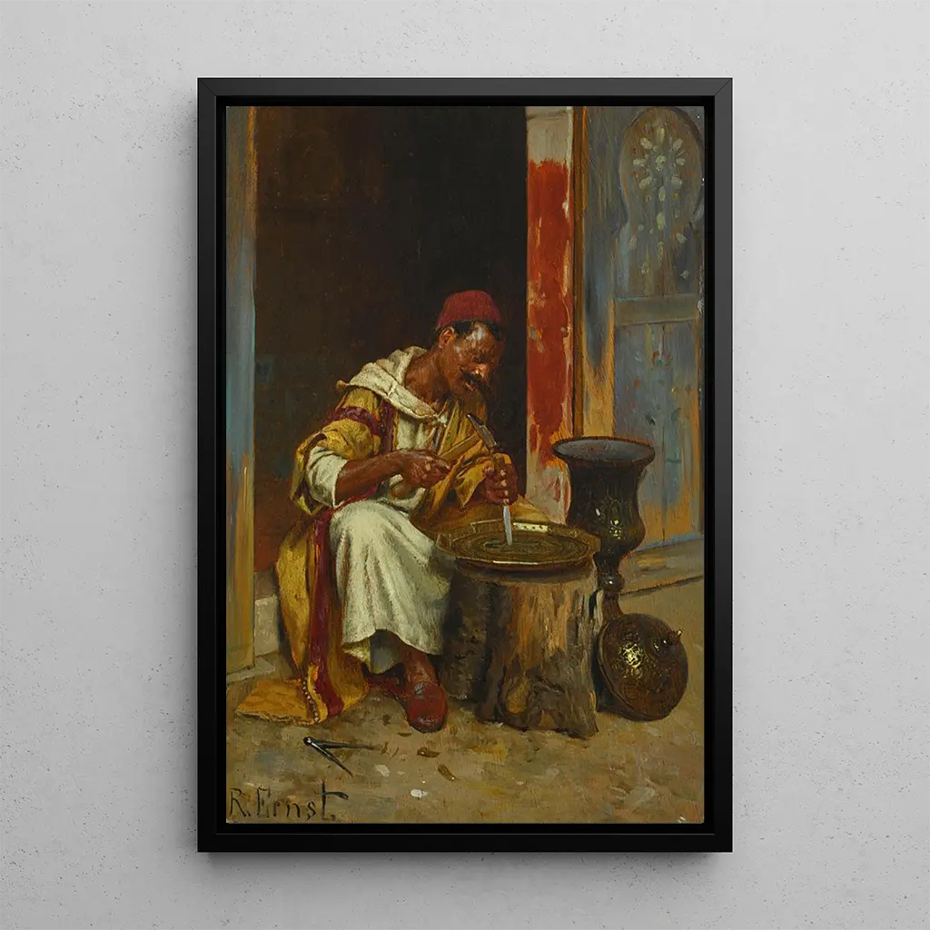 Le Travailleur du laiton : hołd dla tradycyjnego rzemiosła W "Le Travailleur du laiton" Rudolf Ernst uchwycił istotę rzemiosła z niezrównaną biegłością. Płótno przedstawia skupionego rzemieślnika, otoczonego narzędziami i błyszczącymi metalami, gdzie złote i miedziane odcienie harmonijnie się przenikają. Światło odgrywa kluczową rolę, oświetlając delikatne detale pracy z miedzią i tworząc ciepłą, intymną atmosferę. Artysta potrafi przekazać głębokie uznanie dla ręcznej wiedzy i umiejętności, zapraszając widza do zanurzenia się w ten moment twórczości. Każdy pociągnięcie pędzla zdaje się drgać energią ciężkiej pracy, oddając hołd epoce, w której rzemiosło było sercem codziennego życia. Rudolf Ernst : mistrz malarstwa orientalisty Rudolf Ernst, austriacki malarz, jest znany ze swoich orientalnych druków artystycznych, które uchwyciły magię i egzotykę kultur orientalnych. Działający pod koniec XIX wieku, czerpał inspirację z podróży i opowieści o Wschodzie, przekładając te doświadczenia na bogate w szczegóły i kolory obrazy. Jego wykształcenie w Akademii Sztuk Pięknych w Wiedniu i różnorodne wpływy, od realizmu po romantyzm, pozwalają mu rozwijać unikalny styl. "Le Travailleur du laiton" doskonale ilustruje jego talent do przedstawiania codziennego życia i tradycyjnych zawodów, jednocześnie oferując okno na fascynujący, często nieznany szerokiej publiczności świat. Dekoracyjny nabytek z wieloma zaletami Reprodukcja "Le Travailleur du laiton" to element dekoracyjny, który wzbogaci każde wnętrze, niezależnie od tego, czy jest to salon, biuro czy sypialnia. Jakość druku gwarantuje niezwykłą wierne oddanie szczegółów oryginalnego dzieła, pozwalając odczuć głębię i ciepło kolorów. Ten obraz przyciąga wzrok i wzbudza ciekawość, jednocześnie dodając elegancji i autentyczności Twojej dekoracji. Wybierając tę reprodukcję, nadajesz swojemu wnętrzu inspirującą atmosferę, jednocześnie celebrując rzemiosło i piękno pracy ręcznej.