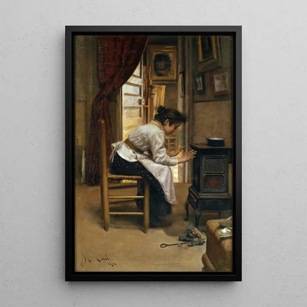 Dans "Près du feu", Manuel Cusí y Ferret nous plonge dans une atmosphère réconfortante, où la lumière dansante des flammes éclaire doucement les visages des personnages. La composition, riche en détails, évoque une convivialité palpable, tandis que les couleurs chaudes, allant des rouges profonds aux oranges éclatants, créent une ambiance accueillante. La technique de l’artiste, mêlant réalisme et touches impressionnistes, donne vie à chaque élément, des textures des vêtements aux reflets du feu. Cette œuvre invite à la contemplation, capturant un moment fugace de partage et de chaleur humaine.