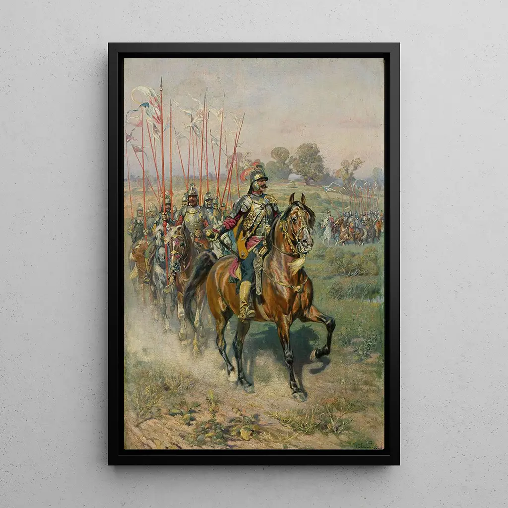 Druk artystyczny "Procesja huzarów" autorstwa Wacława Pawliszaka oddaje energię i ruch wojskowej parady. Huzarzy, ubrani w kolorowe mundury, zdają się z gracją ruszać wzdłuż drogi, podczas gdy żywe kolory i drobiazgowe detale ożywiają scenę. Technika Pawliszaka, łącząca realizm z impresjonistycznymi akcentami, tworzy żywą i dynamiczną atmosferę. Każda postać, z wyrazem twarzy i postawą, opowiada historię, zachęcając widza do zanurzenia się w tym zamrożonym momencie, gdzie honor i odwaga się spotykają.
