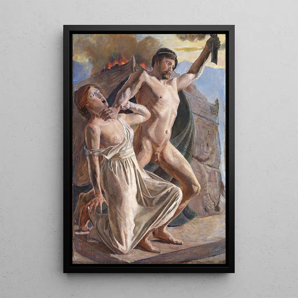 W "Prometeusz kradnie ogień" Poul Simon Christiansen uchwycił dramatyczny moment z mitologii greckiej, w którym tytan Prometeusz, symbol buntu i hojności, kradnie ogień od bogów, by podarować go ludzkości. Scena jest przedstawiona z wyczuwalną intensywnością emocjonalną, gdzie żywe kolory i uderzające kontrasty oddają walkę między cieniem a światłem. Technika Christiansena, łącząca realizm z romantyzmem, podkreśla dynamikę tego odważnego gestu, tworząc atmosferę jednocześnie heroicznej i tragicznej.