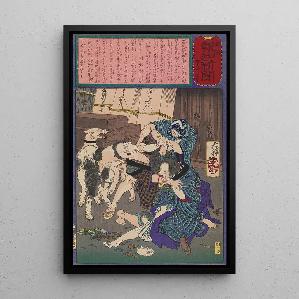 Druk artystyczny obrazu Prostituowane amatorskie walczące o klienta autorstwa Tsukioka Yoshitoshi ukazuje dynamiczną scenę pełną emocji. Żywe kolory i ekspresyjne ruchy postaci świadczą o mistrzostwie artysty w sztuce ukiyo-e. To dzieło, jednocześnie prowokujące i poruszające, ilustruje napięcia życia miejskiego w czasach Edo, gdzie relacje międzyludzkie często były naznaczone walką i przetrwaniem. Technika Yoshitoshiego, z jej drobiazgowymi detalami i uderzającymi kontrastami, tworzy namacalną atmosferę, zanurzając widza w tej złożonej rzeczywistości.