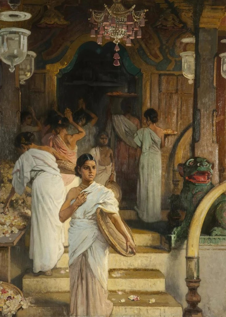 Friedrich Woldemar, malarz XIX wieku, jest znany z przedstawień egzotycznych krajobrazów i scen inspirowanych jego podróżami. Pod wpływem romantyzmu potrafił uchwycić esencję kultur, które spotkał, zwłaszcza w Indiach. Woldemar studiował techniki malarskie swoich współczesnych, rozwijając własny styl, charakteryzujący się staranną dbałością o szczegóły i żywą paletą barw. Jego dzieło "Przed hinduskim świątynią" świadczy o jego zainteresowaniu Orientem i pragnieniu przybliżenia odległych światów europejskiej publiczności.