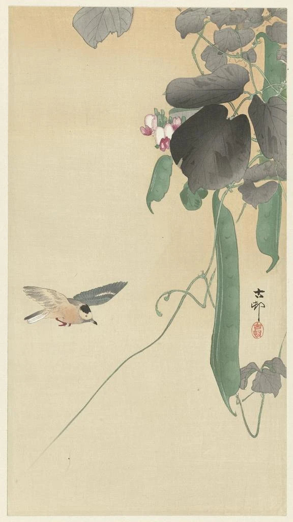 Druk artystyczny | Ptak na roślinie fasoli w kwiatach - Ohara Koson