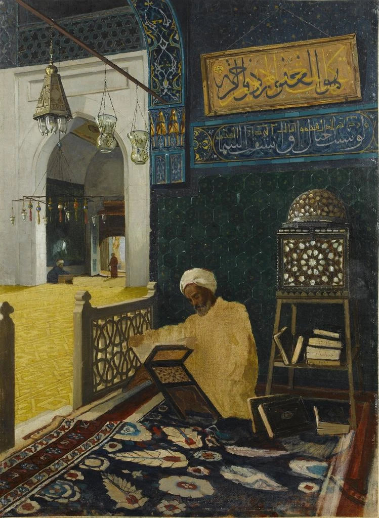 W "Récitant le Coran" Osman Hamdi Bey przenosi nas w chwile oddania i skupienia. Obraz przedstawia mężczyznę, ubranego w tradycyjne stroje, w trakcie czytania świętego fragmentu. Bogate i głębokie kolory, połączone z delikatnym światłem, tworzą atmosferę spokoju i szacunku. Postawa recytatora, skoncentrowanego i spokojnego, odzwierciedla głębię duchowości i znaczenie świętego słowa w kulturze islamskiej. To dzieło, jednocześnie intymne i uniwersalne, zachęca widza do refleksji nad rolą wiary w codziennym życiu.