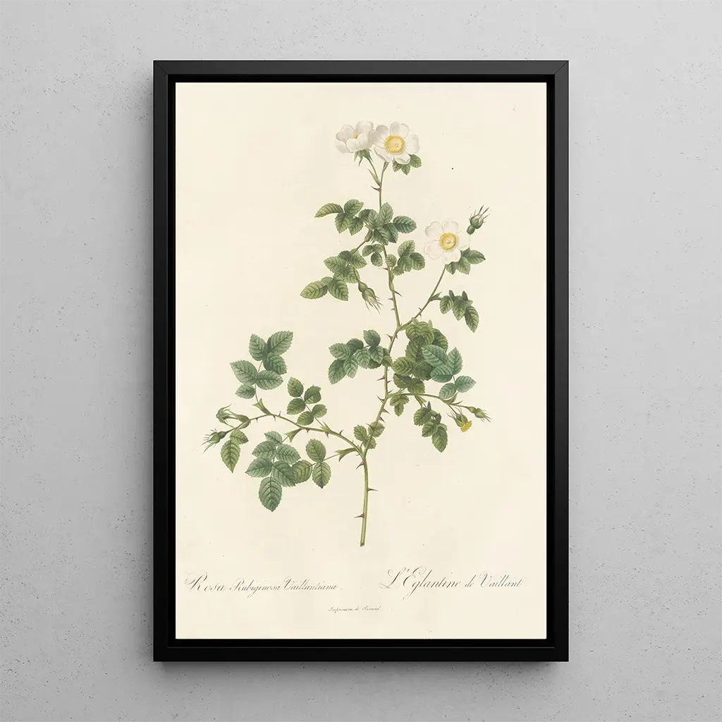 Druk artystyczny Rosa Rubiginosa Vaillantiana przenosi nas do bujnego ogrodu, gdzie piękno kwiatów wyraża się z nieskończoną delikatnością. Odcienie różu i zieleni harmonijnie się przenikają, tworząc uspokajającą kompozycję wizualną. Dzięki technice akwareli Pierre Joseph Redouté potrafi uchwycić światło i teksturę płatków, ożywiając to dzieło botaniczne. Atmosfera emanująca z tego płótna jest pełna łagodności, zachęcając do kontemplacyjnej przerwy w sercu natury.