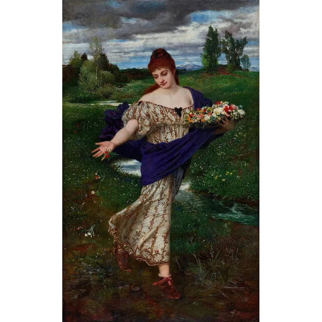 Dans "Flore dispersant des fleurs", Arnold Böcklin nous offre une vision poétique de la déesse de la flore, incarnant la beauté et la générosité de la nature. Les couleurs pastel, douces et lumineuses, évoquent un printemps éternel, tandis que la figure centrale, entourée de fleurs éclatantes, semble danser avec grâce. La technique de Böcklin, qui allie réalisme et éléments mythologiques, crée une atmosphère légère et joyeuse. Chaque pétale, chaque mouvement est une invitation à célébrer la vie et la beauté, faisant de cette œuvre une véritable célébration de la nature et de sa richesse.