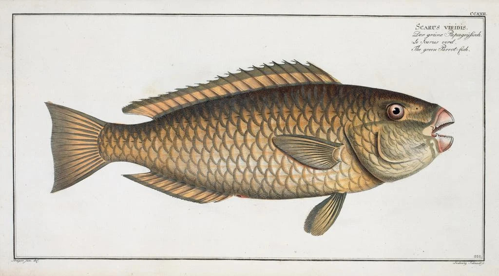 Marcus Elieser Bloch, działający w XVIII wieku, jest znany z wkładu w ichthyologię, naukę o rybach. Jego prace, w tym ta reprodukcja Scarus viridis, świadczą o jego zainteresowaniu bioróżnorodnością morską i pragnieniu uchwycenia piękna gatunków wodnych. Pod wpływem naukowych odkryć swojego czasu, Bloch umiał połączyć sztukę i naukę, tworząc precyzyjne i estetyczne ilustracje. Jego praca wywarła trwały wpływ na przedstawianie ryb i otworzyła drogę przyszłym artystom naturalistom, umacniając jego dziedzictwo w świecie sztuki i nauki.