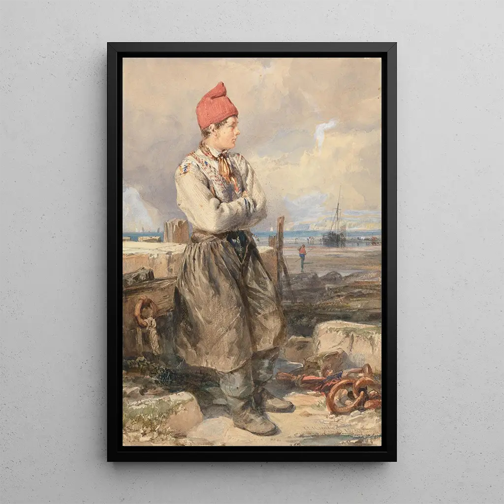 Druk artystyczny "Scena z francuskiego wybrzeża z młodym rybakiem" przywołuje spokojną i sielankową atmosferę, w której odcienie niebieskiego i zielonego harmonijnie się przenikają. James Duffield Harding, mistrz pejzażu, z finezją uchwycił światło dnia odbijające się od spokojnych fal. Młody rybak, umieszczony w centrum obrazu, zdaje się być w doskonałej harmonii z naturą, podczas gdy białe żagle statków na horyzoncie dodają scenie dynamizmu. Technika pastelowa, stosowana przez Hardinga, nadaje dziełu delikatność i lekkość, które zachęcają do kontemplacji.