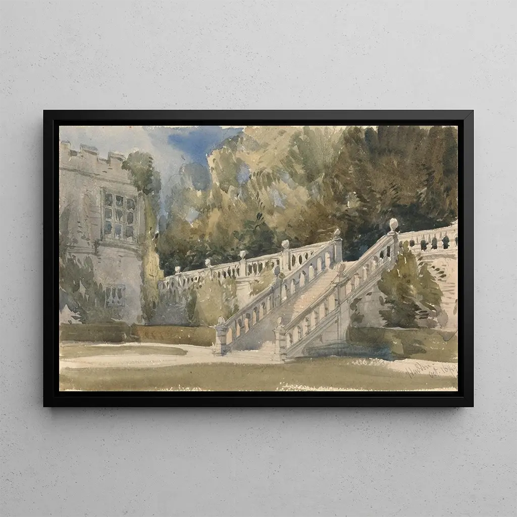 Dzieło "Escalier de Jardin Haddon Hall" autorstwa Williama Callow przenosi nas do świata, w którym natura i architektura spotykają się z gracją. Delikatna kompozycja schodów, otoczonych bujną zielenią, wywołuje spokojną i kontemplacyjną atmosferę. Łagodne kolory, od głębokiej zieleni po odcienie ziemiste, tworzą uspokajającą równowagę wizualną. Technika Callow, charakteryzująca się dbałością o szczegóły i mistrzostwem w operowaniu światłem, ożywia tę scenę, zachęcając widza do wyobrażenia sobie spaceru po tym czarującym ogrodzie.