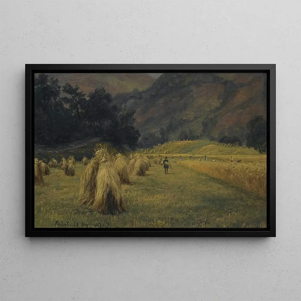 W tej reprodukcji Meules de foin Rydal Cumbria, Thomas Fearnley uchwycił istotę angielskiej wsi. Słupy siana, ustawione niczym strażnicy pośród zielonego krajobrazu, są zanurzone w delikatnym świetle, które przywołuje spokój letniego popołudnia. Ciepłe, ziemiste kolory harmonijnie się łączą, podczas gdy niebo, pokryte lekkimi chmurami, dodaje scenie poetyckiego wymiaru. Technika Fearnleya, łącząca precyzję z impresjonizmem, tworzy atmosferę spokoju, zachęcając widza do zanurzenia się w tym pełnym życia obrazie.