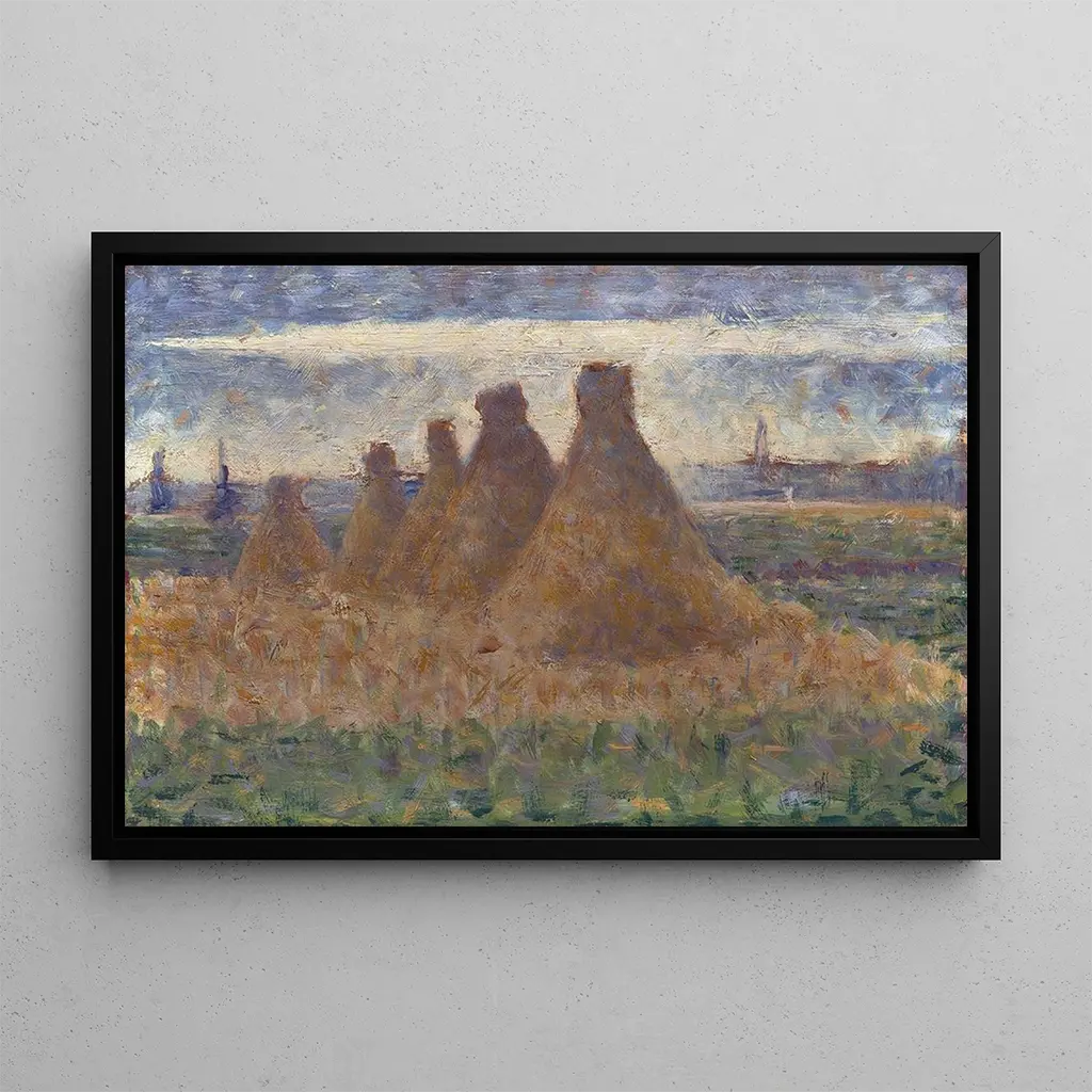 "Snopy siana" Georges'a Seurata uchwycają istotę wiejskiego krajobrazu skąpanego w świetle. Za pomocą palety żywych kolorów artysta wykorzystuje technikę pointylizmu, aby stworzyć spokojną i poetycką atmosferę. Pociągnięcia pędzla, nakładane z precyzją, tworzą harmonijną kompozycję, w której snopy majestatycznie wyrastają pod letnim niebem. Dzieło wywołuje uczucie spokoju, zachęcając widza do zanurzenia się w tej idyllicznej scenie, gdzie czas zdaje się zatrzymany.