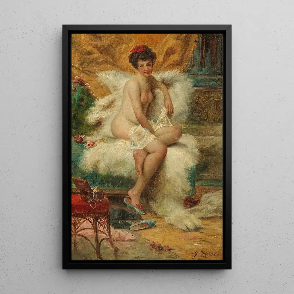 Hans Zatzka, peintre autrichien du XIXe siècle, est surtout connu pour ses œuvres empreintes de sensualité et de mystère. Influencé par le mouvement symboliste, il se distingue par sa capacité à capturer des moments de rêve et d'introspection. Ses compositions, souvent peuplées de figures féminines idéalisées, reflètent une esthétique romantique et une fascination pour la beauté. Zatzka a su s'imposer dans le monde de l'art grâce à son style unique, mêlant réalisme et éléments fantastiques, ce qui lui a permis de laisser une empreinte durable dans l'histoire de l'art.