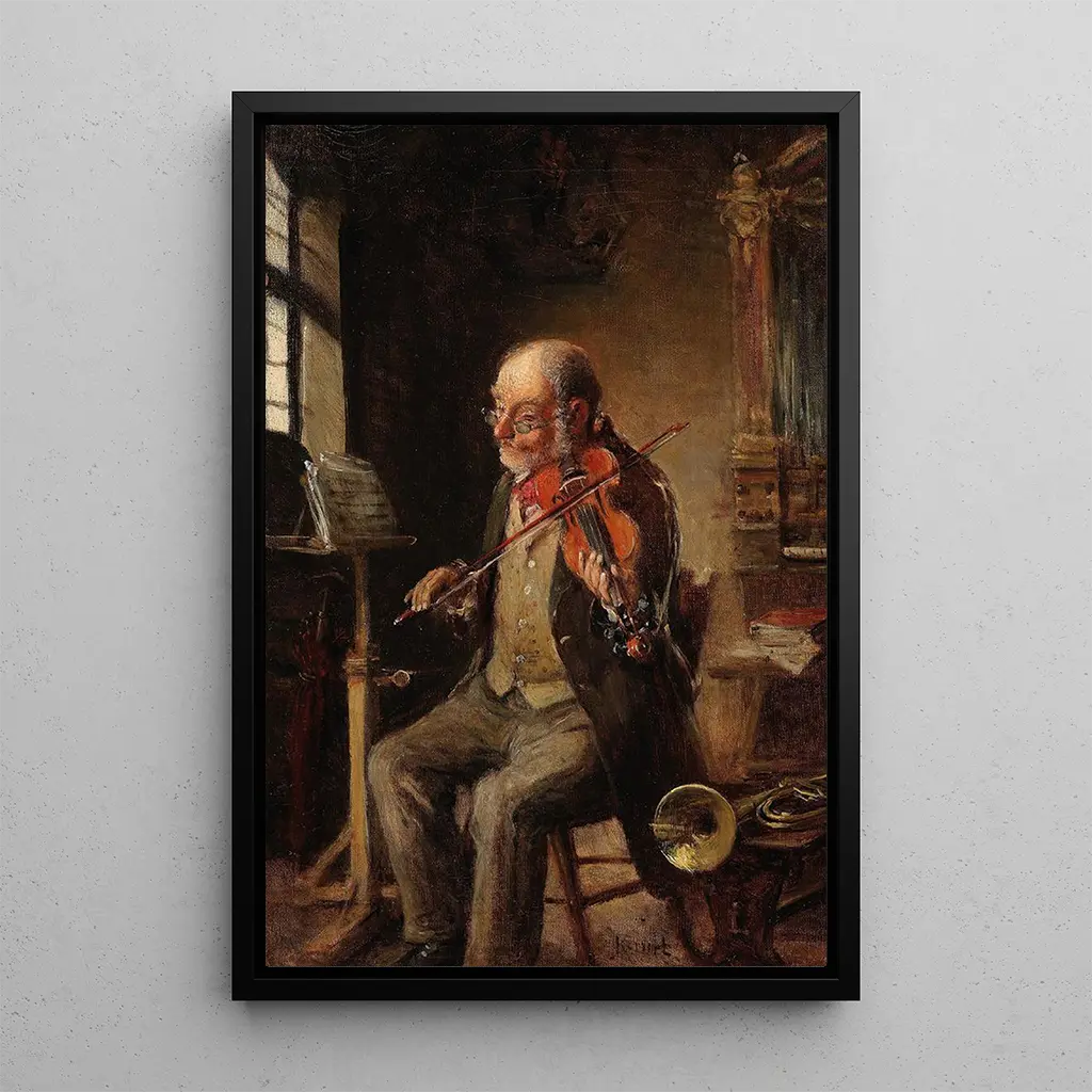 Obraz "Violinista" Hermanna Kerna uchwyca istotę muzyki poprzez żywą i emocjonalną reprezentację. Ciepłe i bogate kolory, mieszające odcienie czerwieni i złota, otaczają muzyka w niemal mistycznej atmosferze. Technika artysty, łącząca realizm z odrobiną impresjonizmu, pozwala odczuć pasję violinisty, którego twarz wyraża głęboką koncentrację. Każdy pociągnięcie pędzla zdaje się drgać w rytm muzyki, zachęcając widza do zanurzenia się w tej intymnej i porywającej scenie.