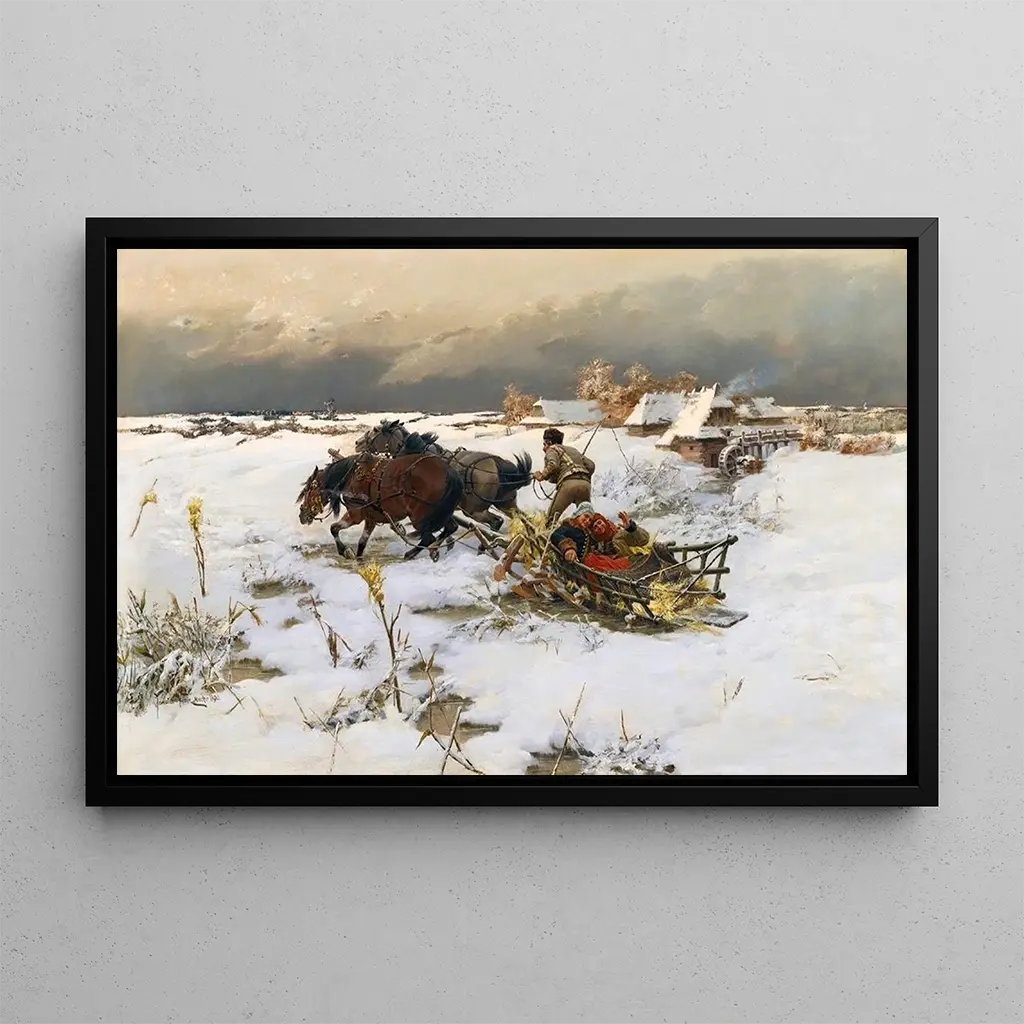 La promenade en traîneau : un instant figé dans la neige La reproduction de La promenade en traîneau de Jaroslav Věšín capture un moment de joie hivernale, où la neige immaculée enveloppe le paysage. Les traîneaux colorés, tirés par des chevaux, contrastent avec le blanc éclatant du sol, créant une scène vivante et dynamique. La technique de Věšín, mêlant réalisme et touches impressionnistes, donne vie à cette œuvre, où chaque détail, des flocons de neige aux visages souriants, contribue à l’atmosphère festive et chaleureuse de l’hiver. Jaroslav Věšín : un artiste au cœur de la tradition tchèque Jaroslav Věšín, né en 1870, est un artiste tchèque dont le travail reflète l’essence de la culture et des traditions de son pays. Évoluant principalement au début du XXe siècle, il s’est inspiré des paysages et des scènes de la vie quotidienne, intégrant des éléments folkloriques dans son art. Věšín a su capturer l’esprit de son époque, mêlant influences impressionnistes et éléments de la peinture réaliste. Son œuvre, souvent empreinte de nostalgie, témoigne d’un profond attachement à ses racines et à la beauté des traditions tchèques. Une acquisition décorative aux multiples atouts La reproduction de La promenade en traîneau est un choix décoratif qui apportera une touche chaleureuse et festive à votre intérieur. Que ce soit dans un salon, une salle à manger ou un bureau, ce tableau évoque des souvenirs d’hiver et de convivialité. Sa qualité de reproduction assure une fidélité aux couleurs et aux détails de l’œuvre originale, faisant de cette toile un élément central de votre décoration. L’attrait esthétique de cette œuvre en fait un ajout idéal pour ceux qui souhaitent célébrer la beauté des saisons et des moments partagés.