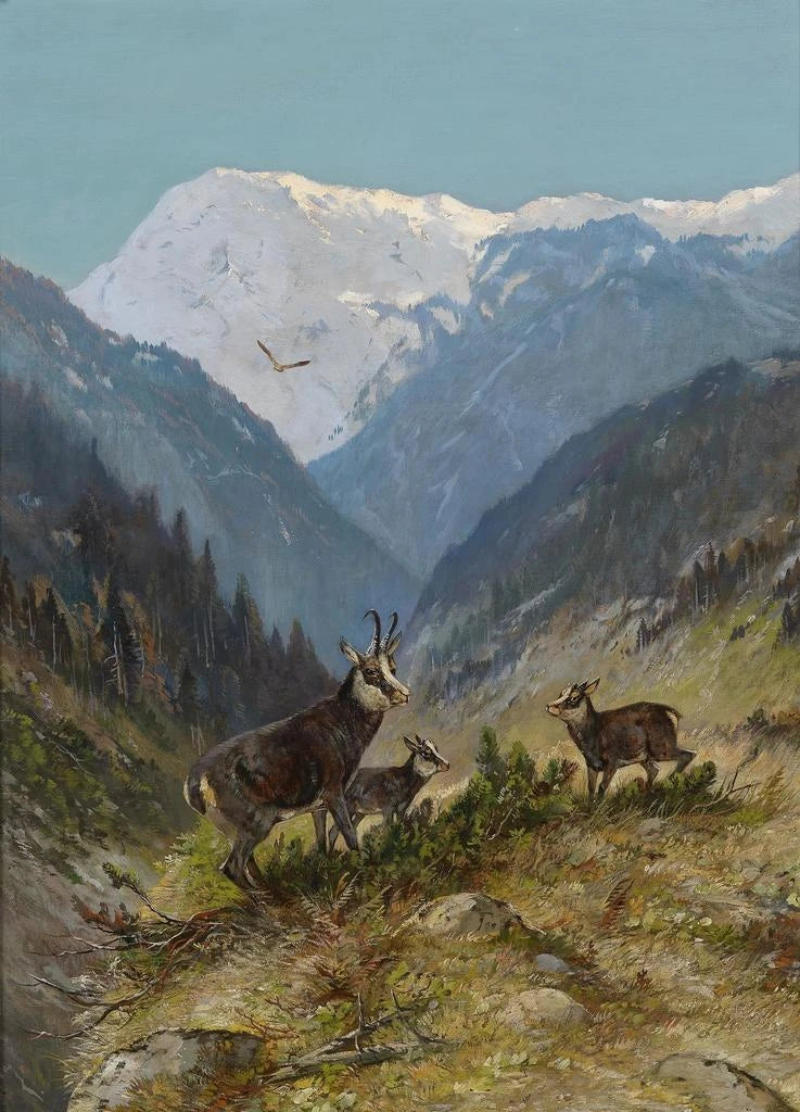 Dans cette représentation saisissante, Moritz Müller capture l'essence même de la vie sauvage à travers un troupeau de chamois évoluant dans un paysage montagneux. Les nuances de brun et de gris des animaux se fondent harmonieusement avec les rochers et la végétation environnante, créant une atmosphère de tranquillité et de mouvement. La technique de Müller, caractérisée par un réalisme minutieux, permet de ressentir la fraîcheur de l'air montagnard et l'énergie des chamois en pleine nature. Chaque détail, des cornes élégantes aux pattes agiles, témoigne de son observation attentive et de son respect pour ces créatures majestueuses.
